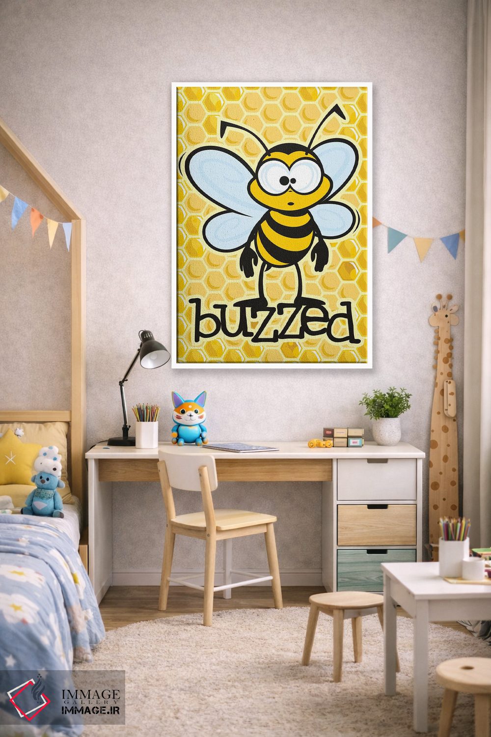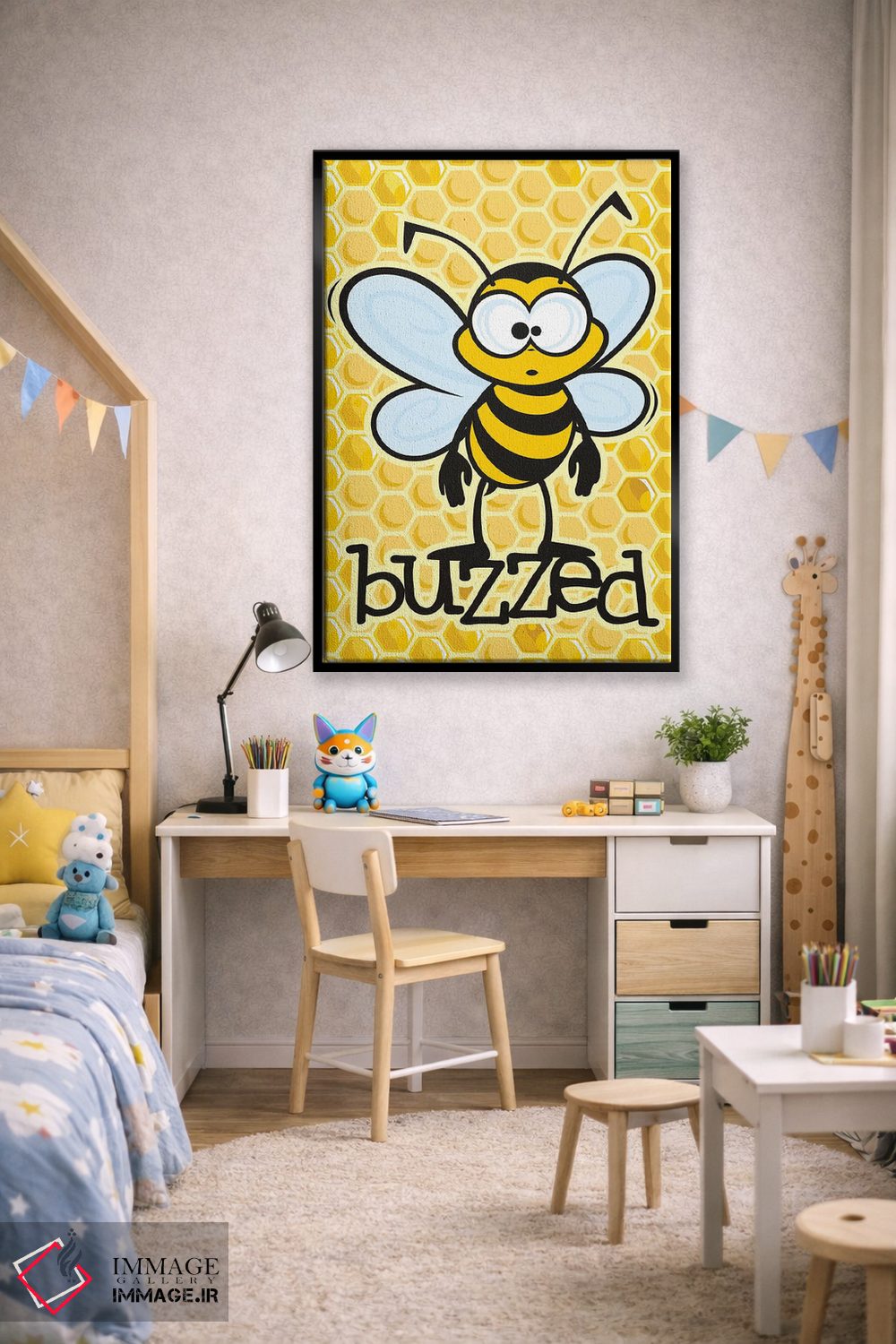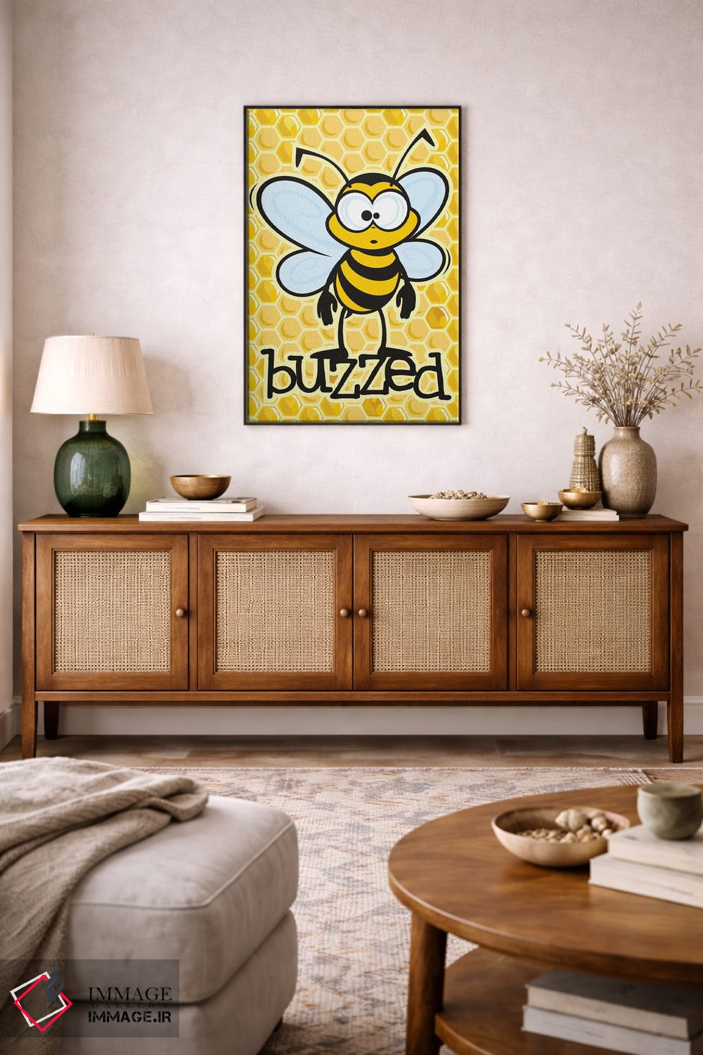 برای اتاقی که به یک عنصر دوستداشتنی نیاز دارد، «سرخوش (با اشاره به زنبور یا مستی)» اثرِ «جیمز لی» به دیوار، انرژیِ نرم و زنده میدهد؛ برای کافههای کوچک و صمیمی انتخابی خوشسلیقه است. هر بار نگاهش میکنید، یک جزئیات تازه به چشم میآید.
