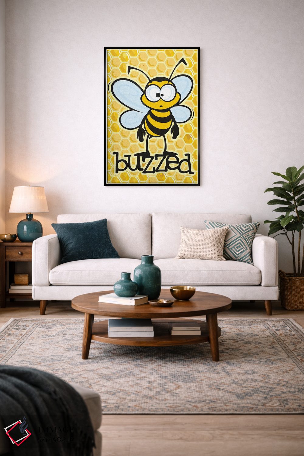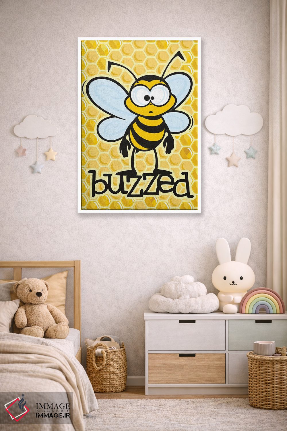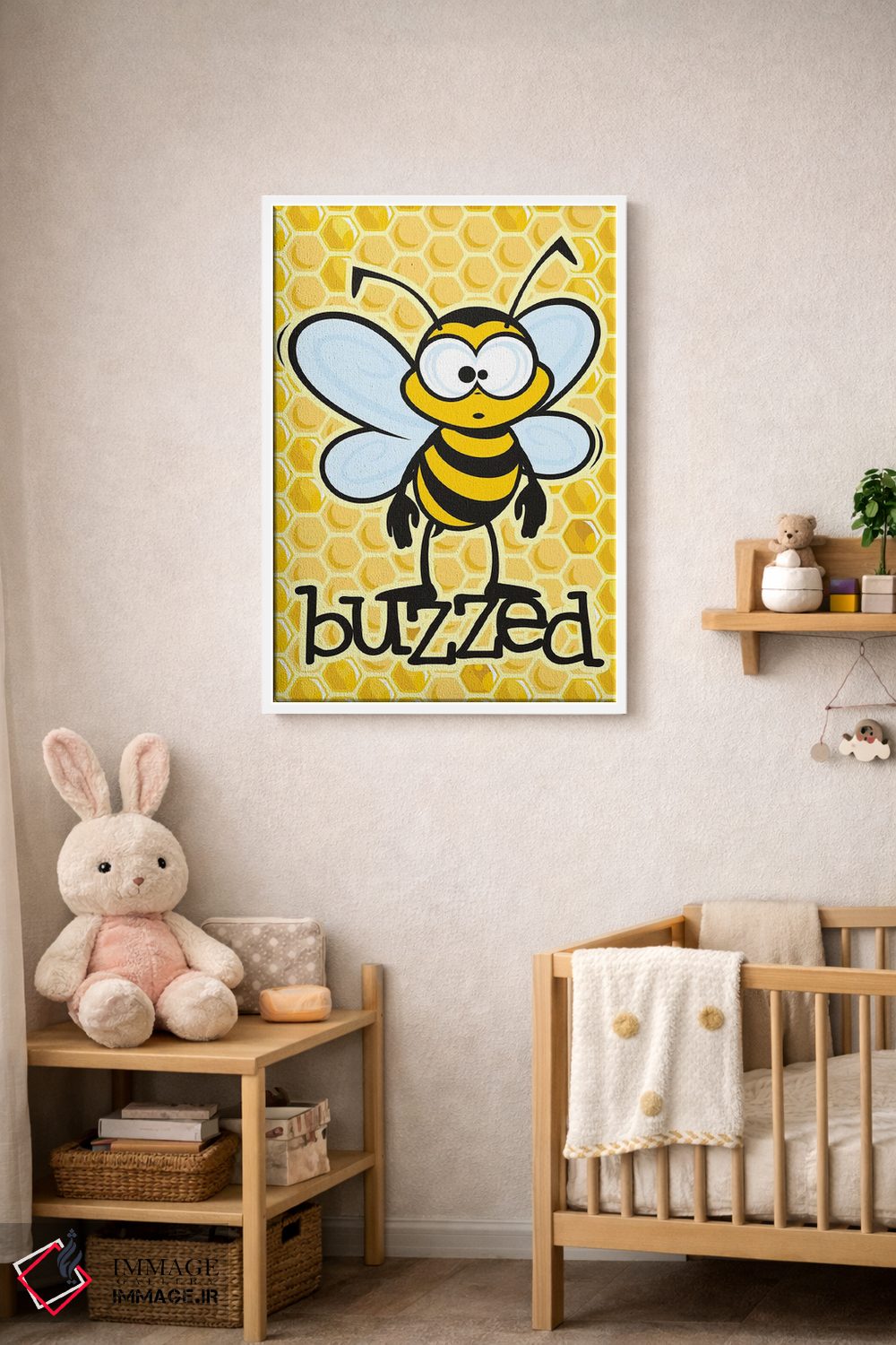 برای اتاقی که به یک عنصر دوستداشتنی نیاز دارد، «سرخوش (با اشاره به زنبور یا مستی)» اثرِ «جیمز لی» به دیوار، انرژیِ نرم و زنده میدهد؛ برای کافههای کوچک و صمیمی انتخابی خوشسلیقه است. هر بار نگاهش میکنید، یک جزئیات تازه به چشم میآید.