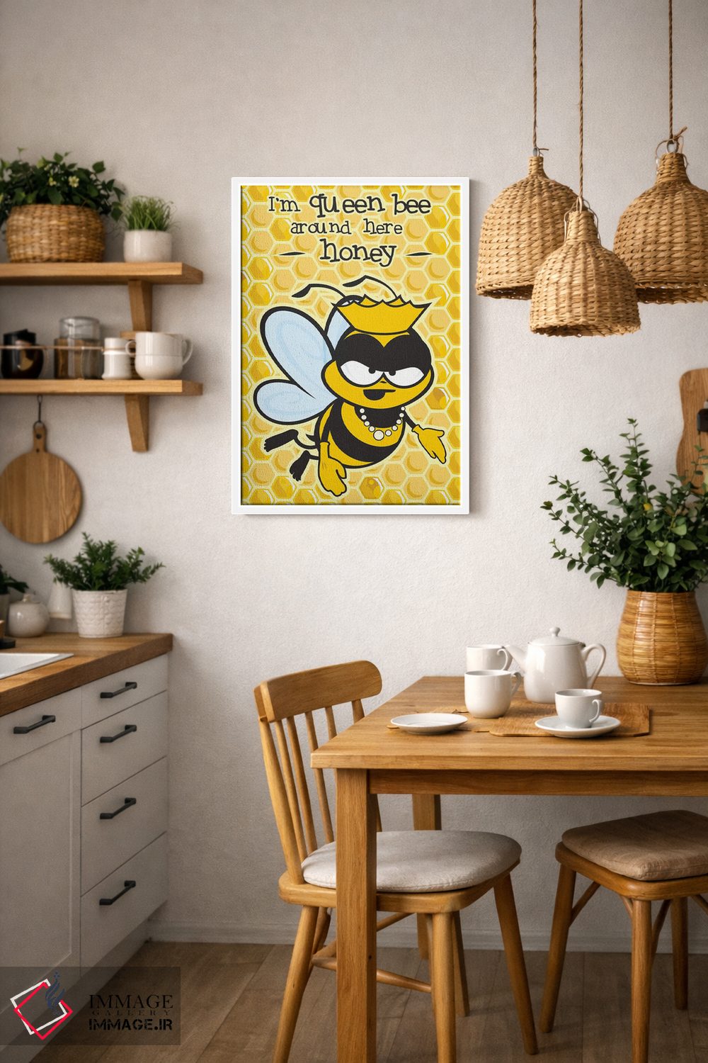 «ملکه زنبورها» اثرِ «جیمز لی» با تایپوگرافیِ کنترلشده، روی دیوار خوب مینشیند؛ برای کنار کتابخانه، میز کار یا راهروهای باریک عالی است.