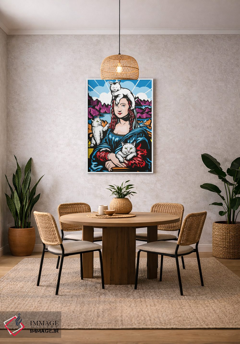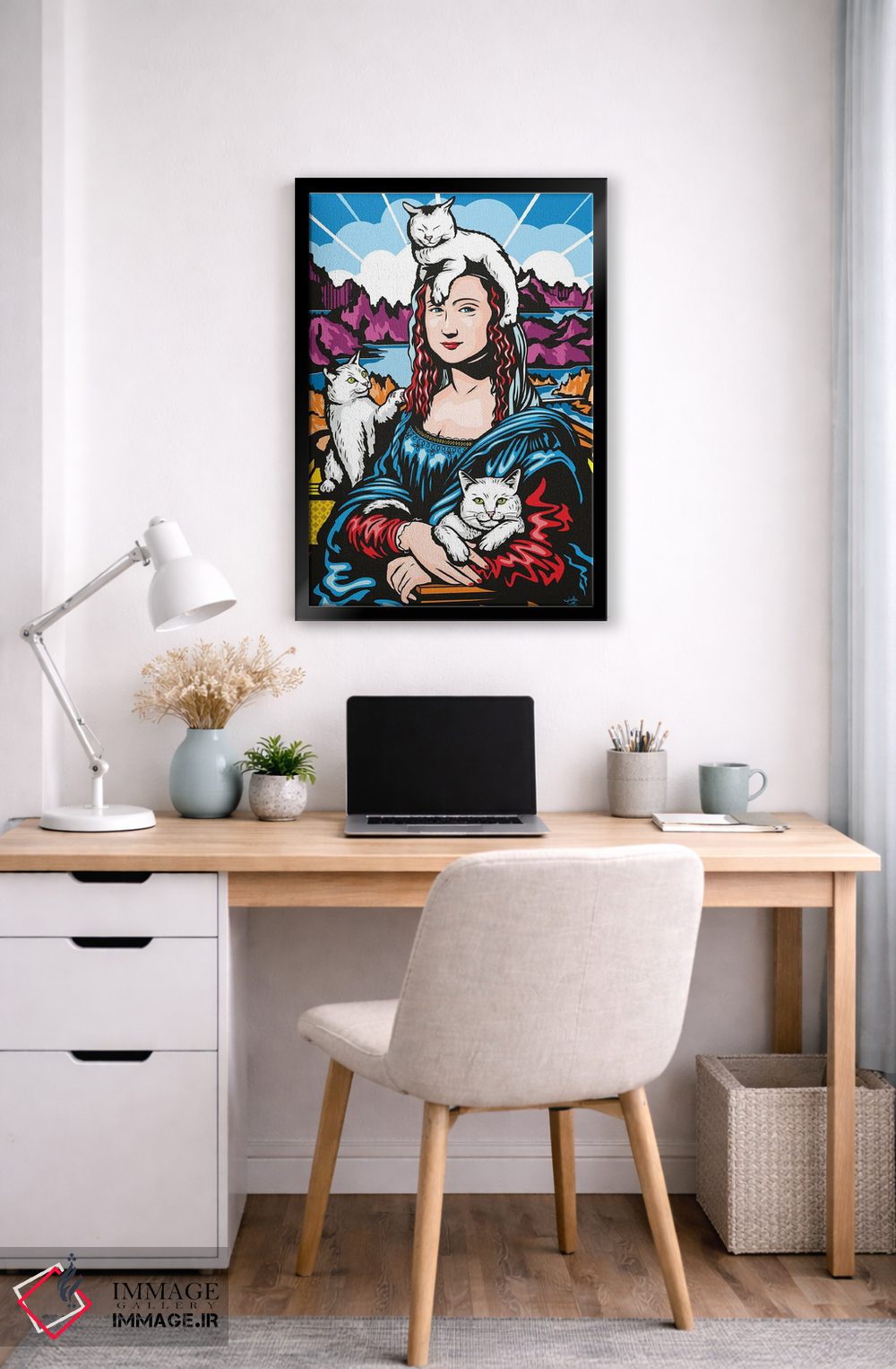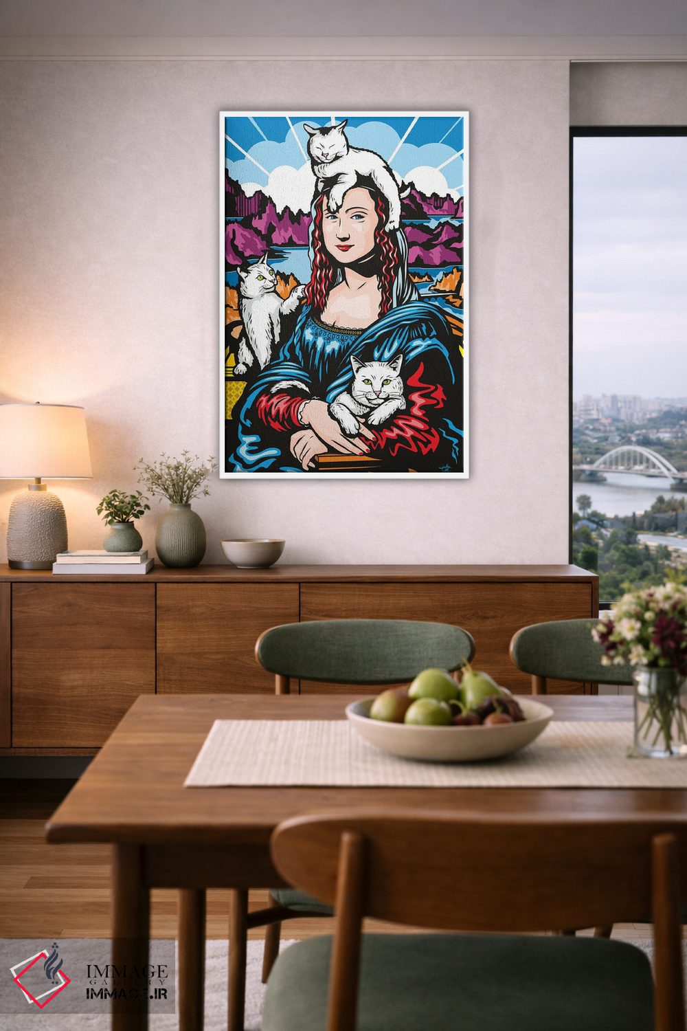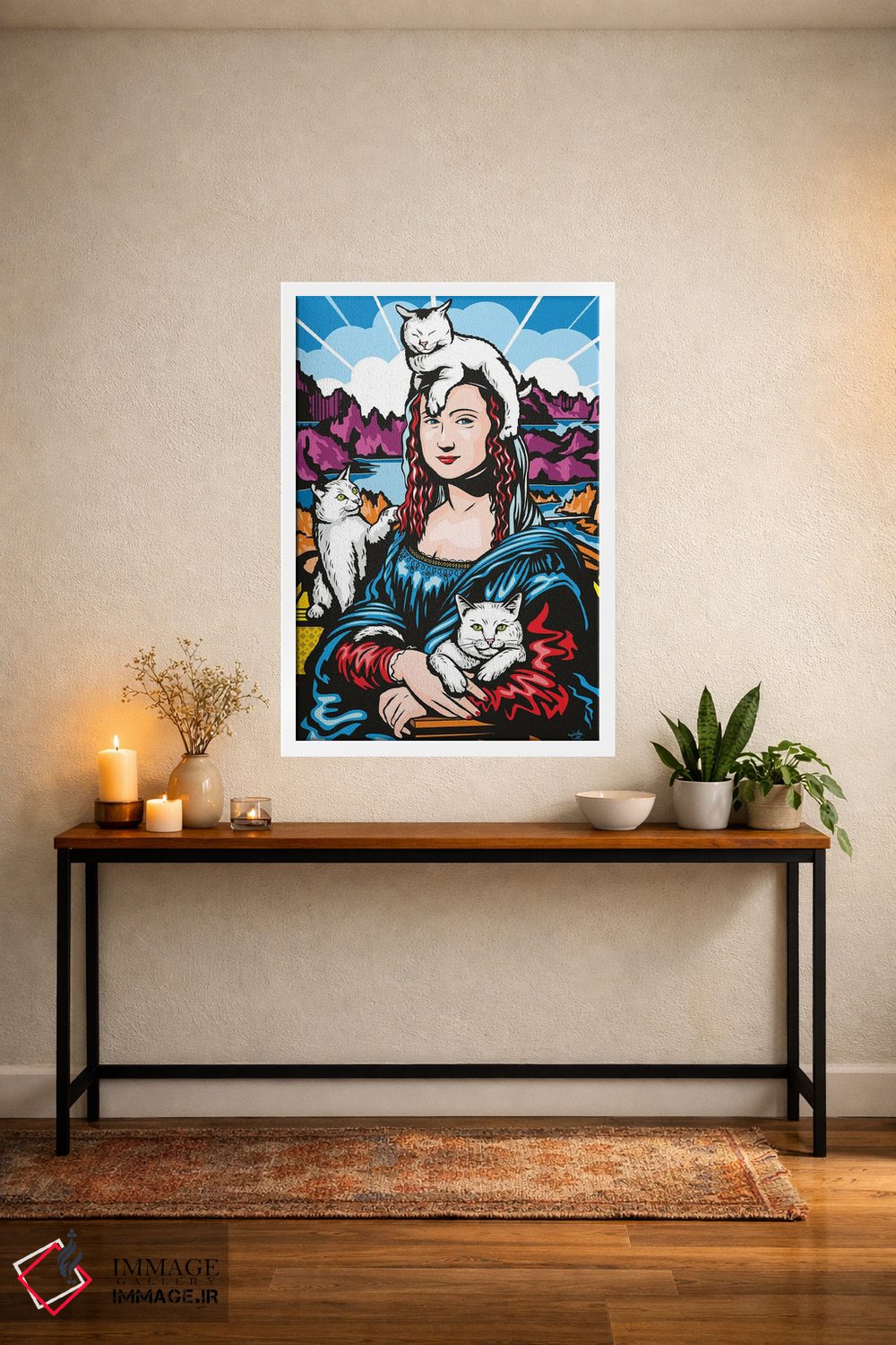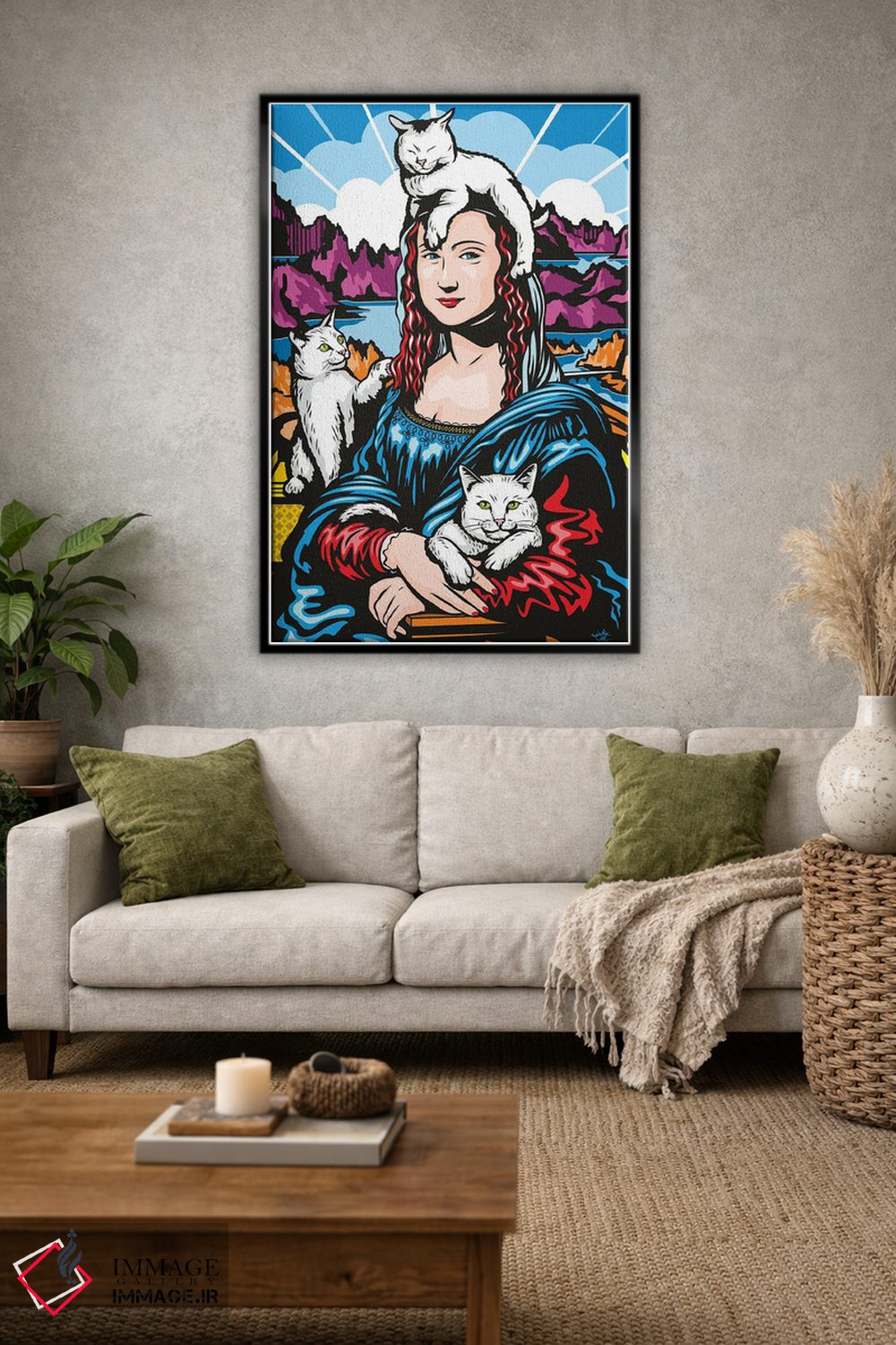 تابلو دکوراتیو مونالیزا با گربه ها اثر جیمز لی - نمای روبه‌رو روی دیوار