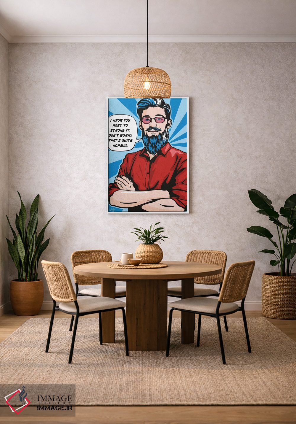 «نوازش ریش» اثرِ «جیمز لی» ترکیببندی متعادل دارد و به دیوار وقار میدهد؛ بدون اینکه فضا را سنگین کند.