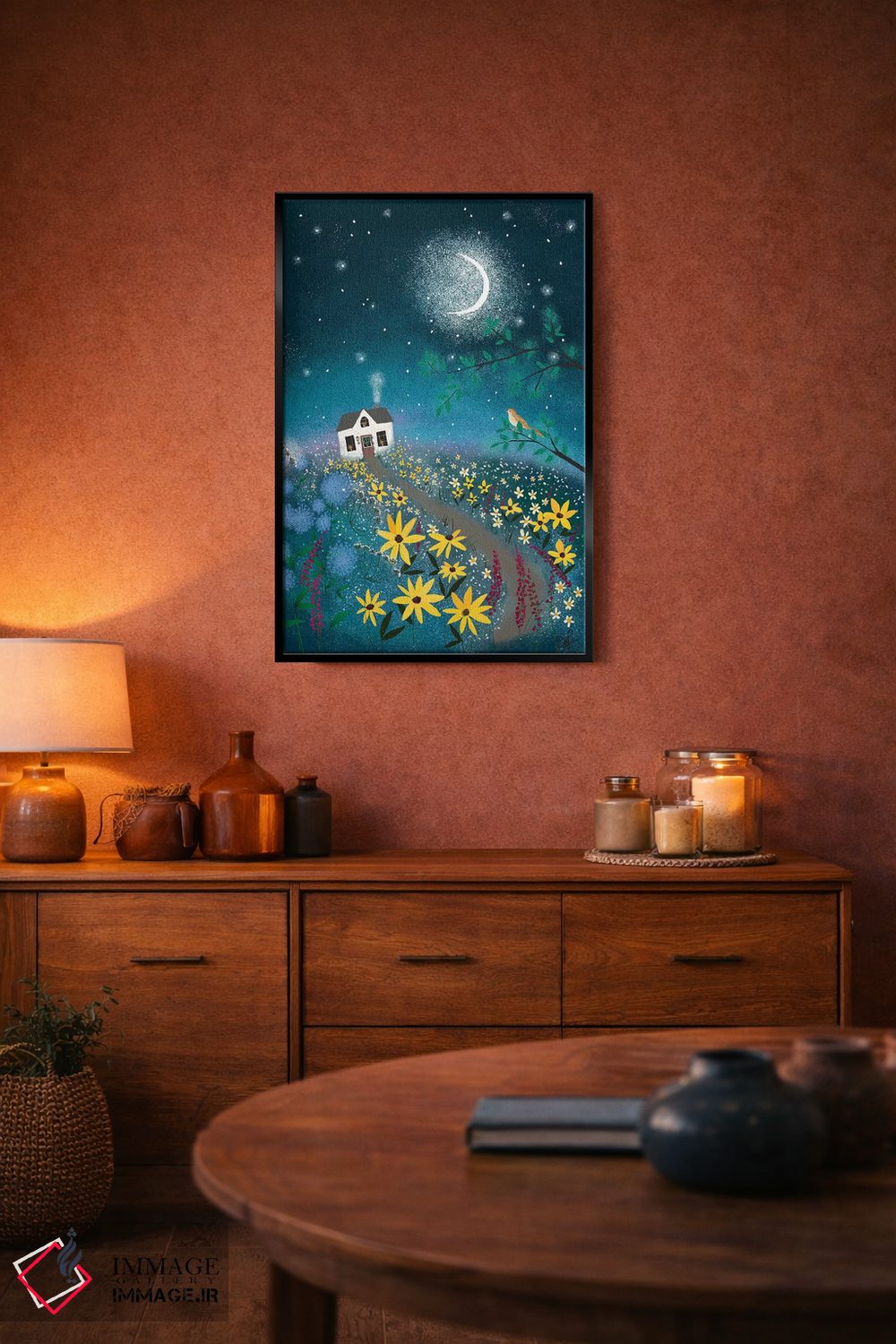 براساس پالت ترکیبی اثر، قاب تیک گرم (چوبی) پیشنهاد اول است و مشکی مات (فریم متوسط) مکمل. برای سفارشهای پروژهای با ابعاد و قابهای اختصاصی با ایماژ در تماس باشید.