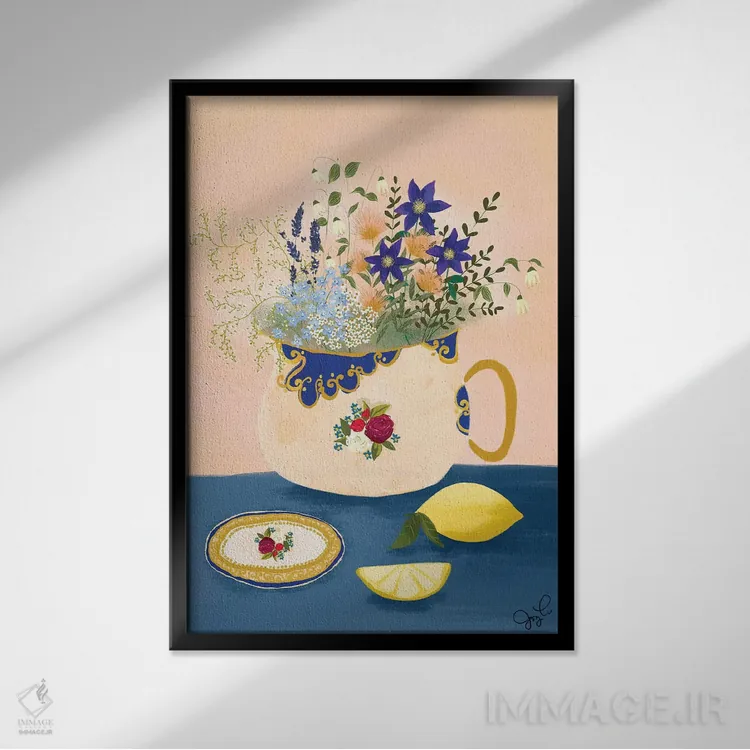 براساس پالت ترکیبی اثر، قاب تیک گرم (چوبی) پیشنهاد اول است و مشکی مات (فریم متوسط) مکمل. برای سفارشهای پروژهای با ابعاد و قابهای اختصاصی با ایماژ در تماس باشید.