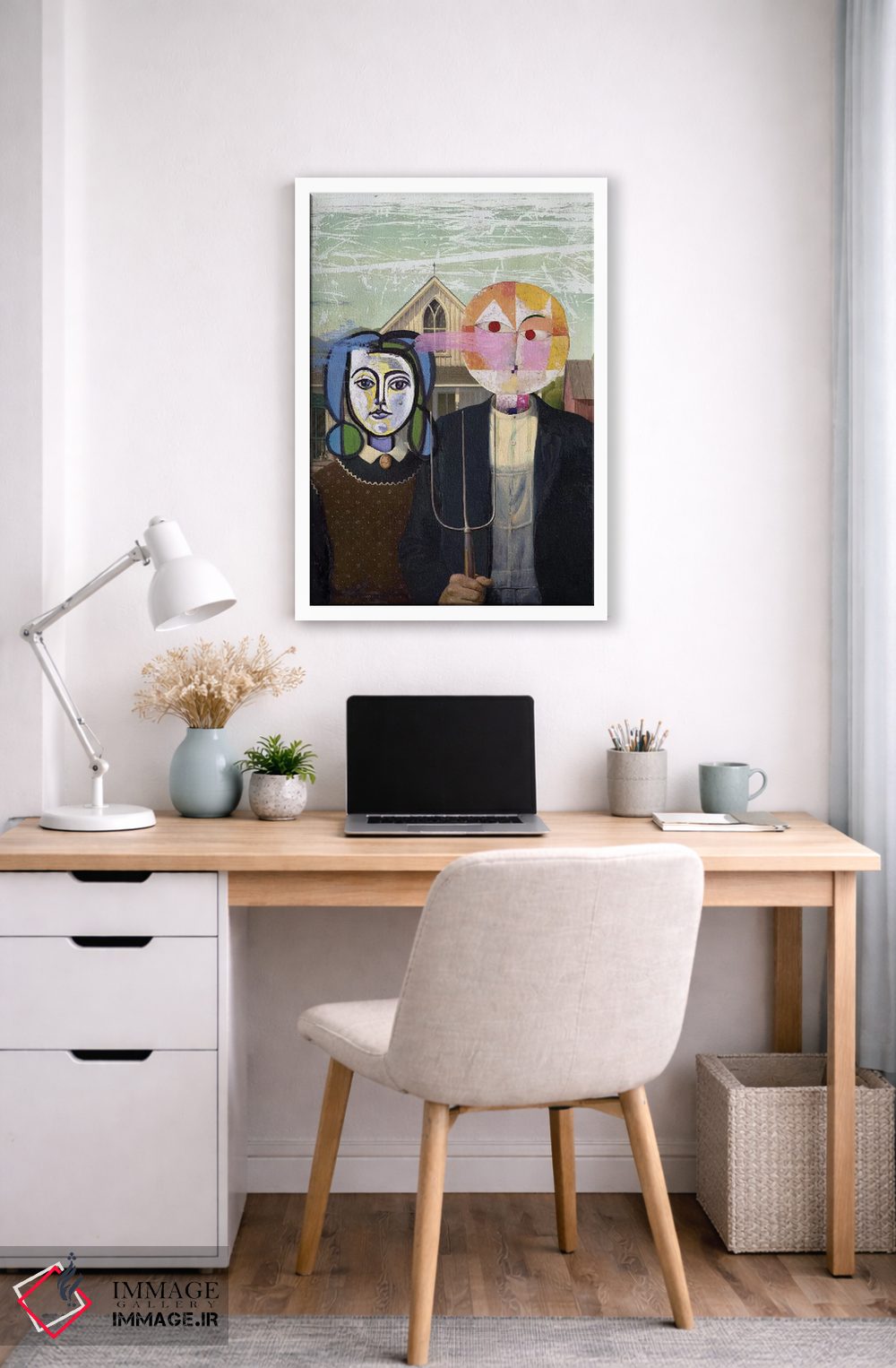 براساس پالت ترکیبی اثر، قاب بلوط روشن (چوبی) پیشنهاد اول است و استخوانی ملایم مکمل. برای سفارشهای پروژهای با ابعاد و قابهای اختصاصی با ایماژ در تماس باشید.