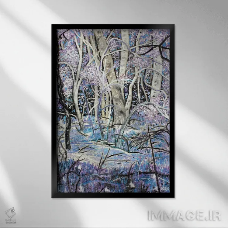 براساس پالت سرد اثر، قاب سفید مات (فریم باریک) پیشنهاد اول است و نقرهای برسخورده (متالیک) مکمل. برای سفارشهای پروژهای با ابعاد و قابهای اختصاصی با ایماژ در تماس باشید.
