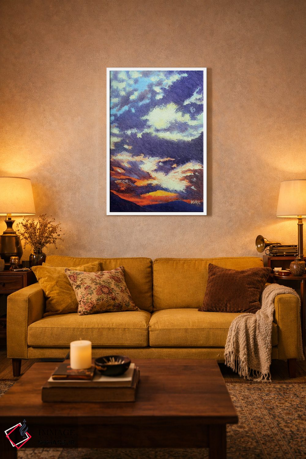 براساس پالت ترکیبی اثر، قاب تیک گرم (چوبی) پیشنهاد اول است و مشکی مات (فریم متوسط) مکمل. برای سفارشهای پروژهای با ابعاد و قابهای اختصاصی با ایماژ در تماس باشید.