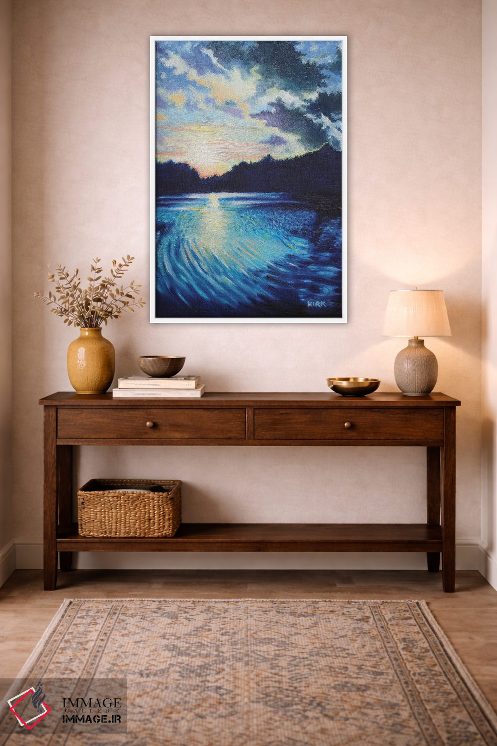براساس پالت سرد اثر، قاب سفید مات (فریم باریک) پیشنهاد اول است و نقرهای برسخورده (متالیک) مکمل. برای سفارشهای پروژهای با ابعاد و قابهای اختصاصی با ایماژ در تماس باشید.