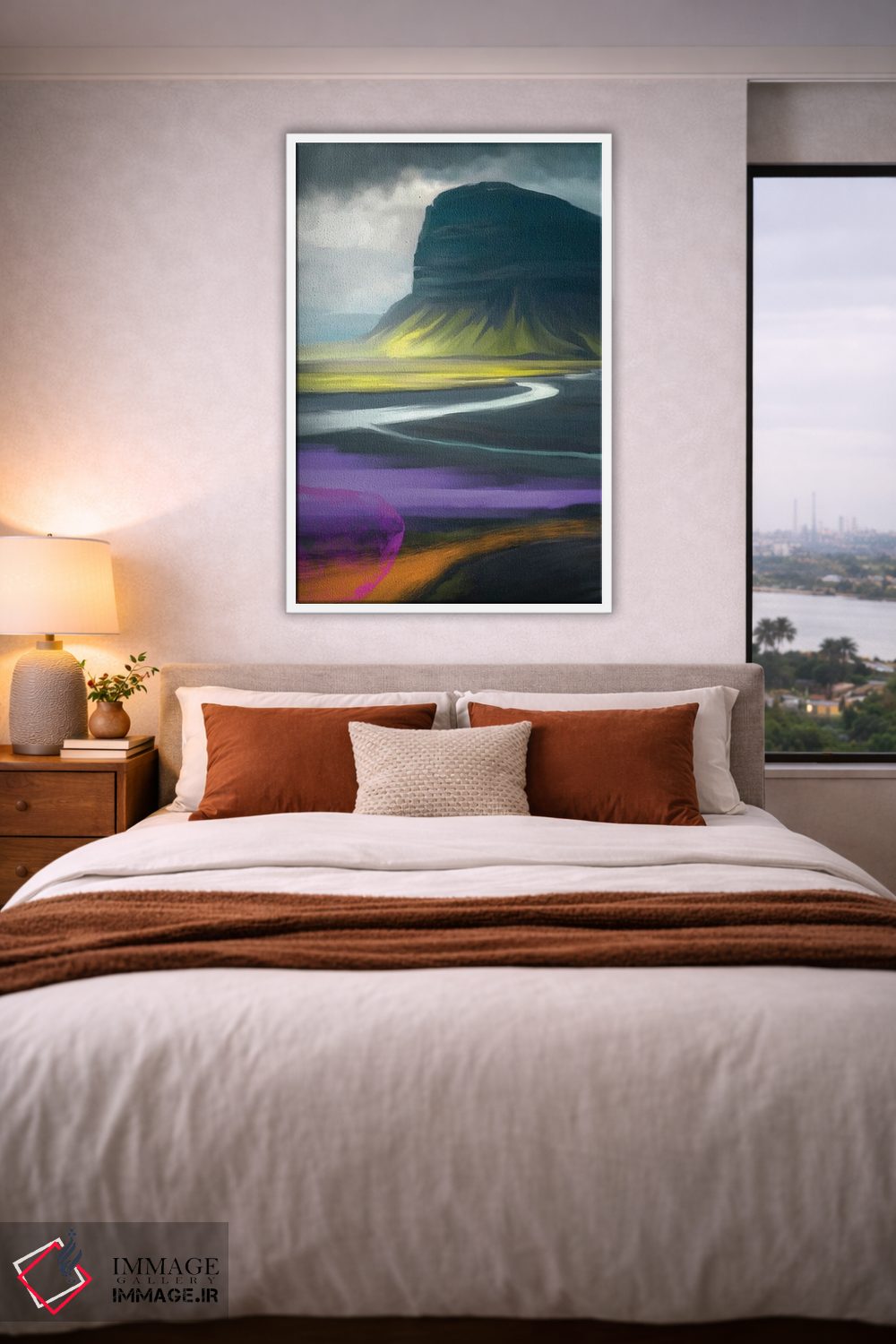«بزرگراه ایسلند بنفش» اثرِ «جولیانا لوومر» یک قاب شهری و مدرن است؛ موضوعِ این اثر با اجرای هنری، کنار مبلمان ساده خیلی خوب مینشیند.