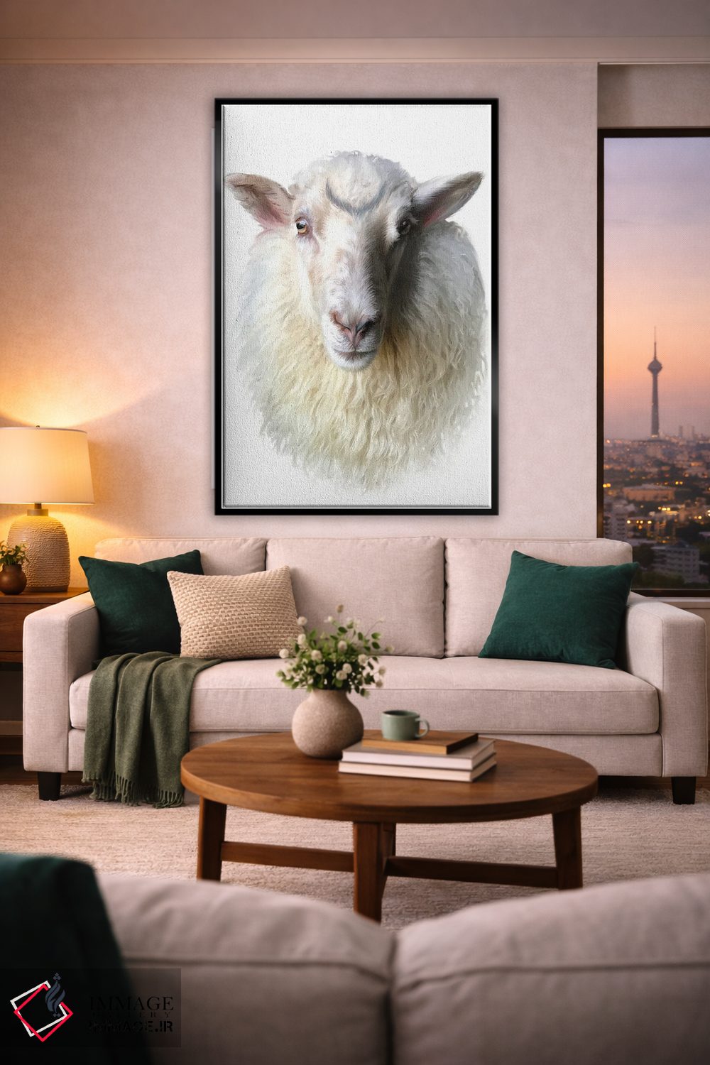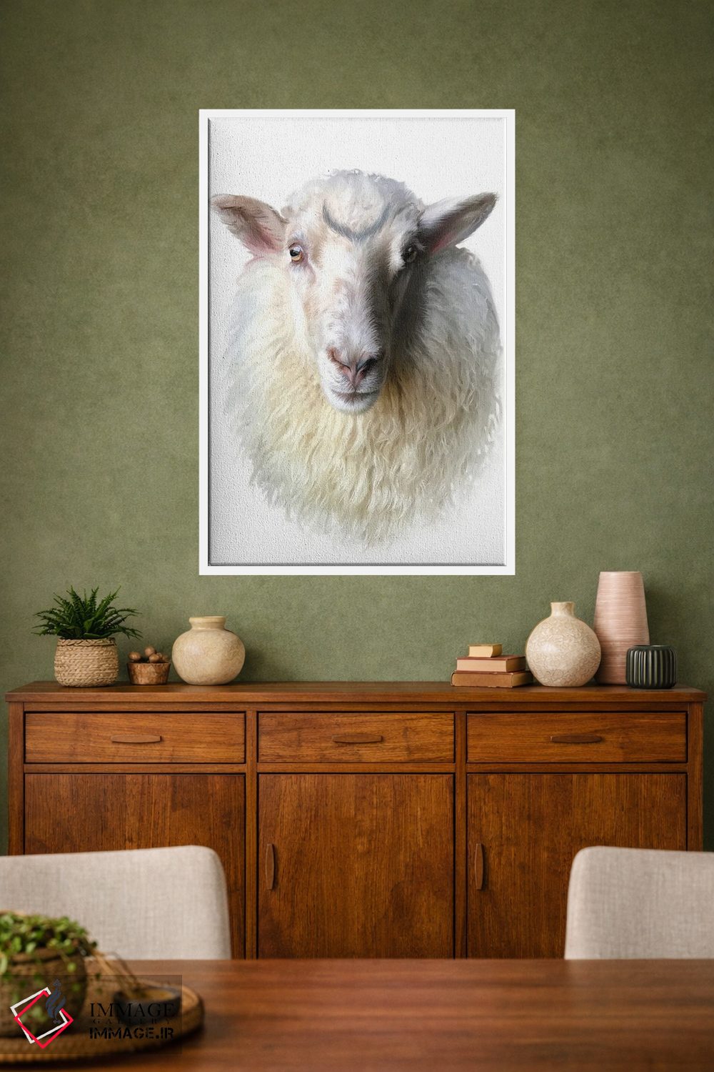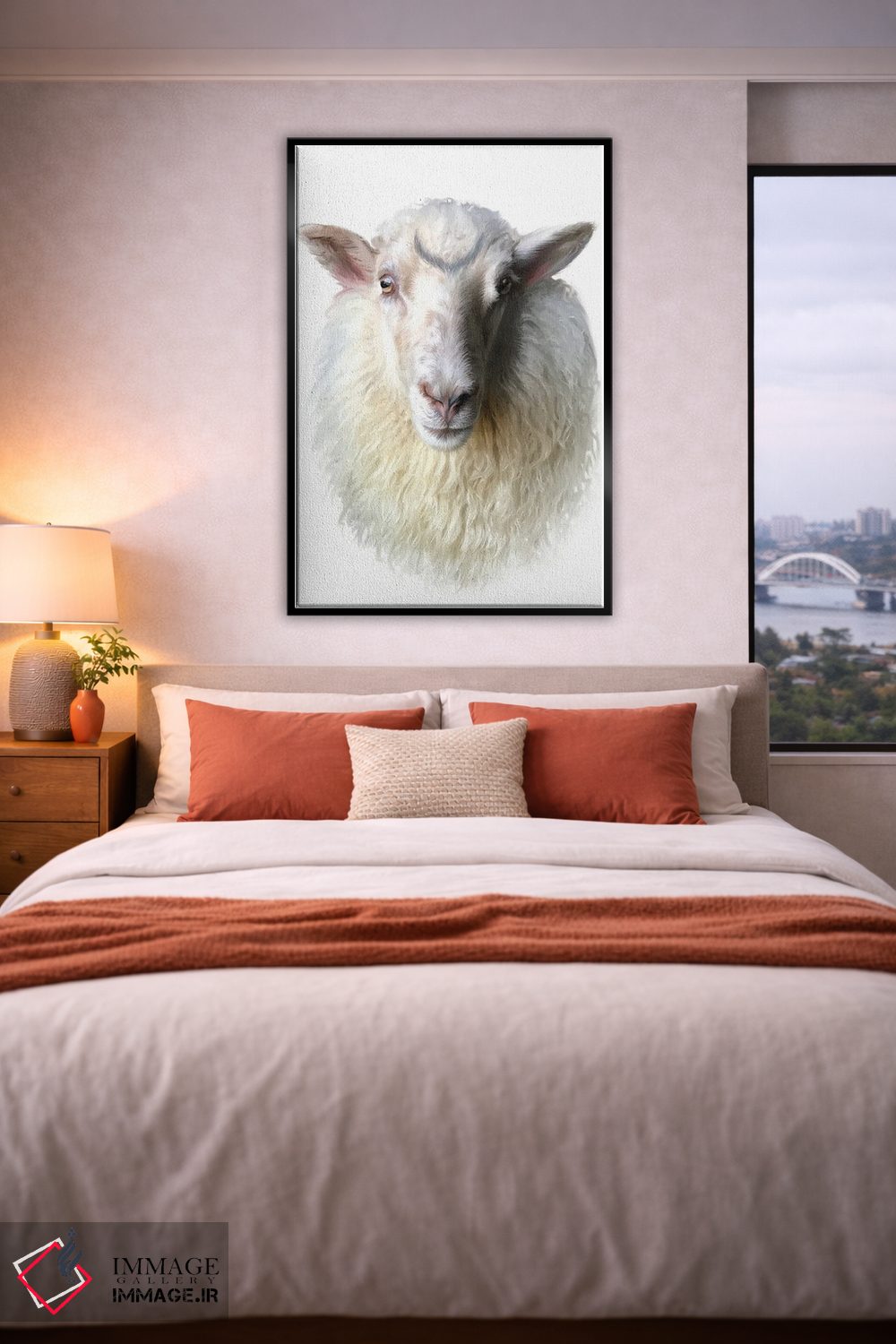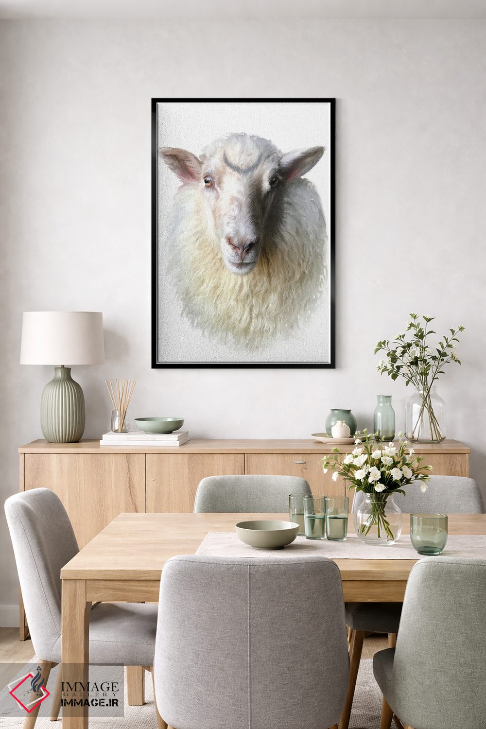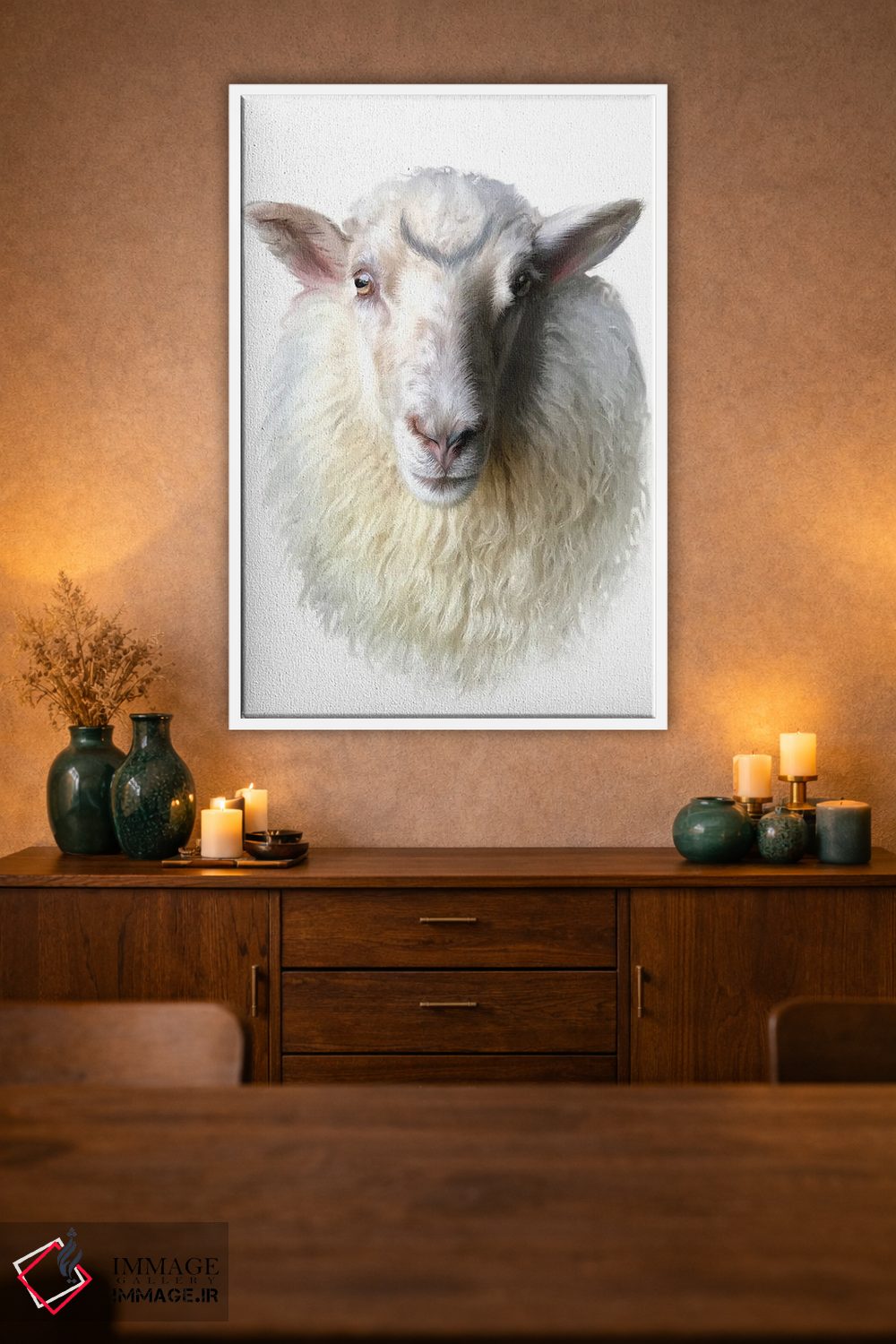 براساس پالت گرم اثر، قاب بلوط روشن (چوبی) پیشنهاد اول است و استخوانی ملایم مکمل. برای سفارشهای پروژهای با ابعاد و قابهای اختصاصی با ایماژ در تماس باشید.