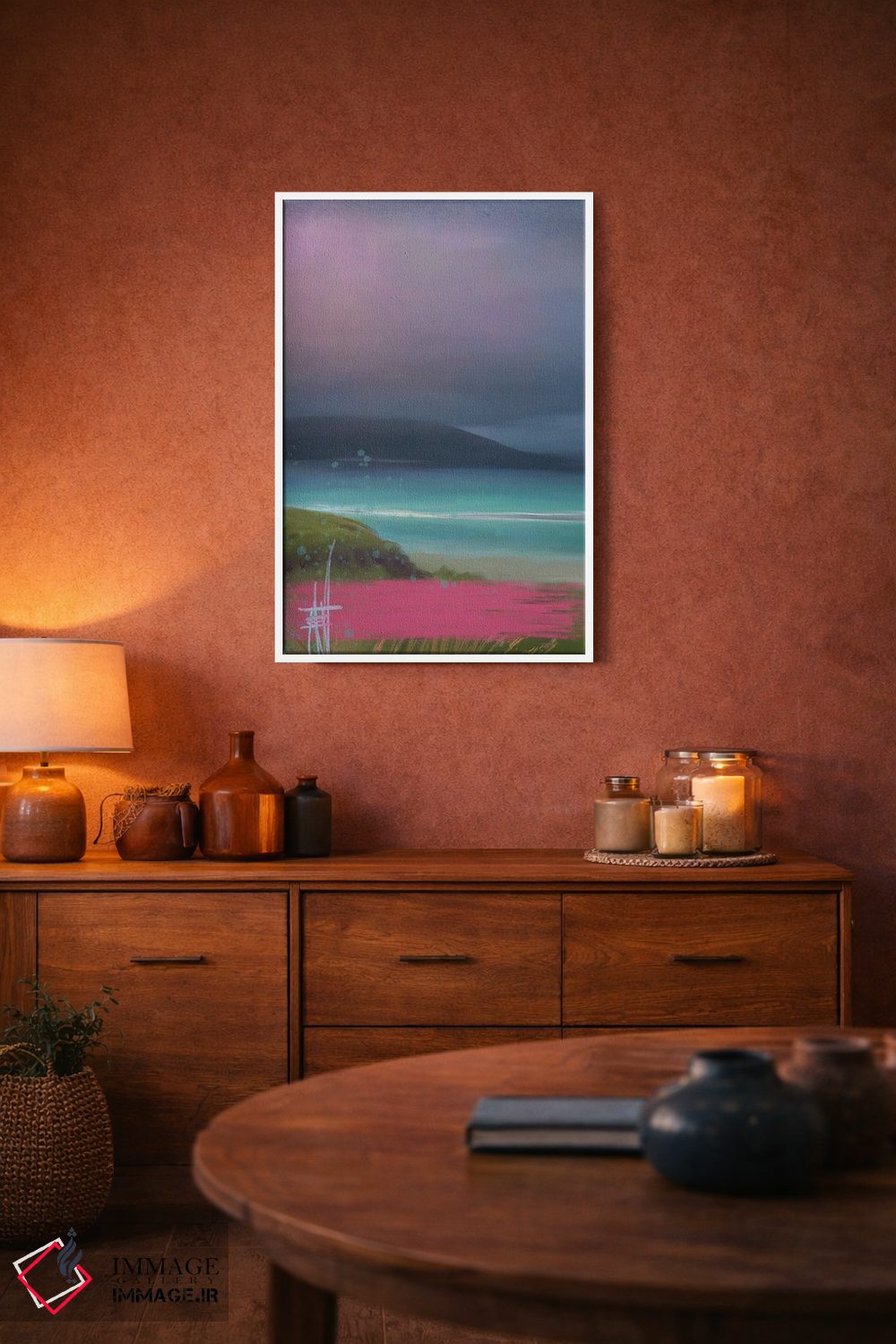 براساس پالت ترکیبی اثر، قاب تیک گرم (چوبی) پیشنهاد اول است و مشکی مات (فریم متوسط) مکمل. برای سفارشهای پروژهای با ابعاد و قابهای اختصاصی با ایماژ در تماس باشید.