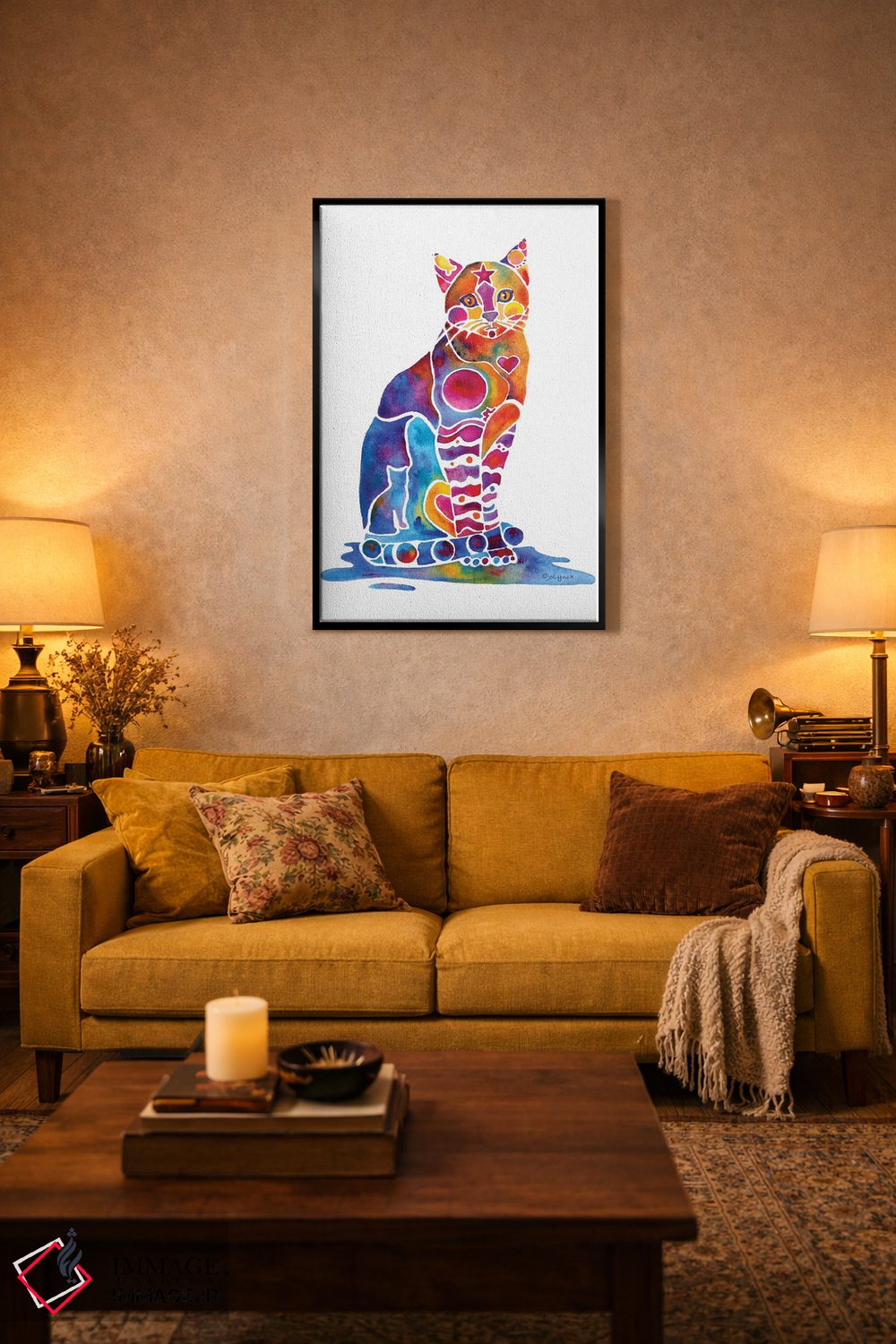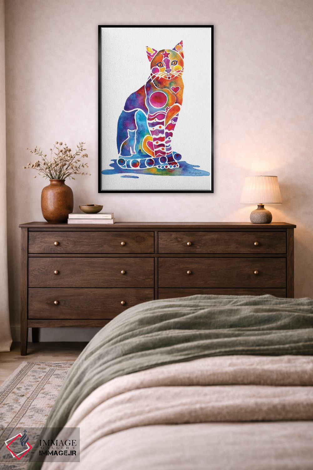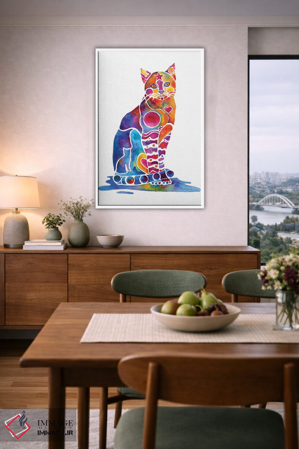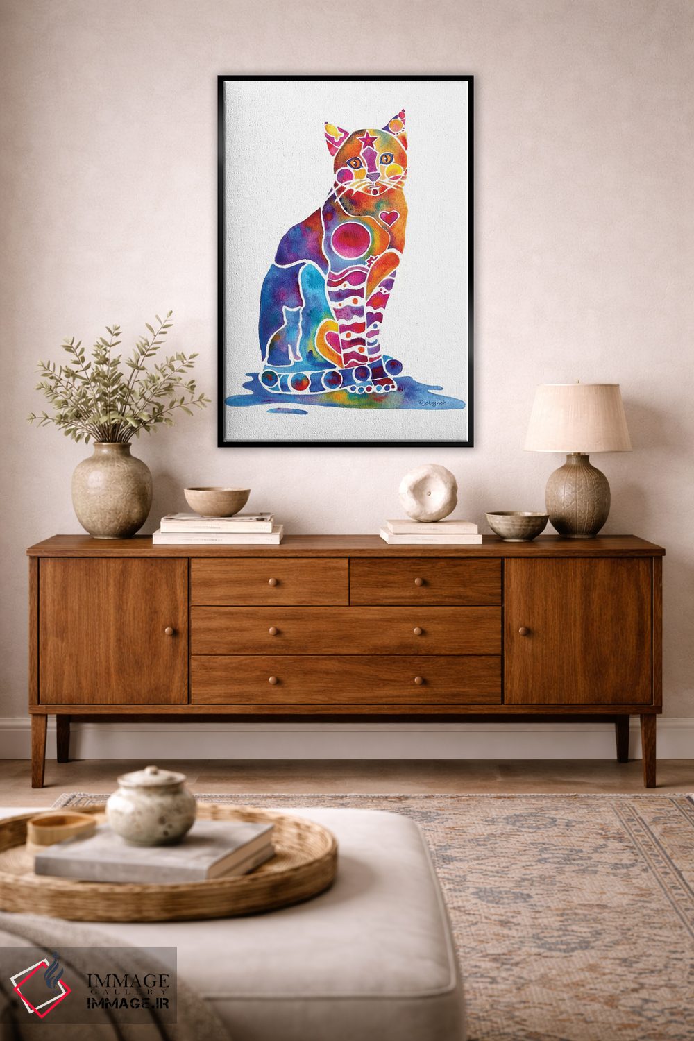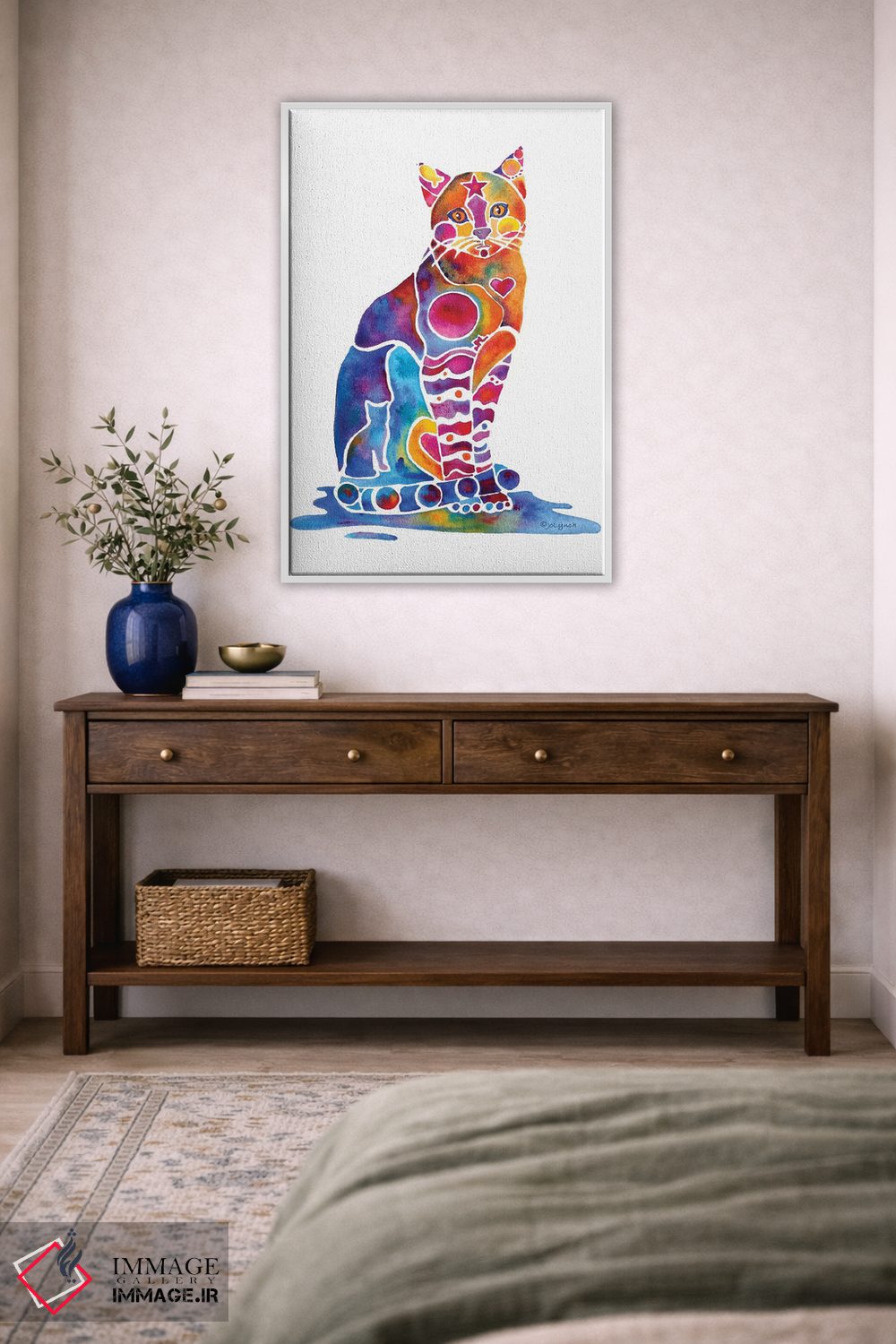 «گربه کارلی» اثرِ «جو لینچ» میتواند به فضا، گرمیِ ملایم اضافه کند؛ برای راهروها و ورودیهای گرم پیشنهاد میشود. برای دیوار گالریوار هم گزینهٔ خوبیست.