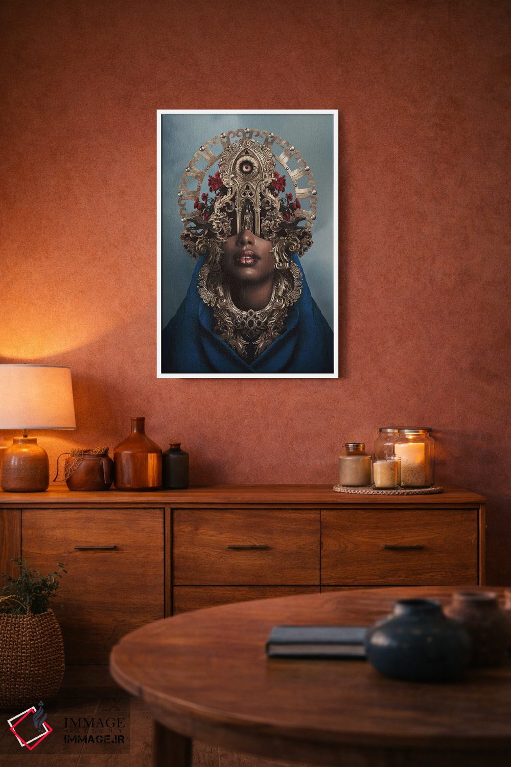براساس پالت ترکیبی اثر، قاب تیک گرم (چوبی) پیشنهاد اول است و مشکی مات (فریم متوسط) مکمل. برای سفارشهای پروژهای با ابعاد و قابهای اختصاصی با ایماژ در تماس باشید.