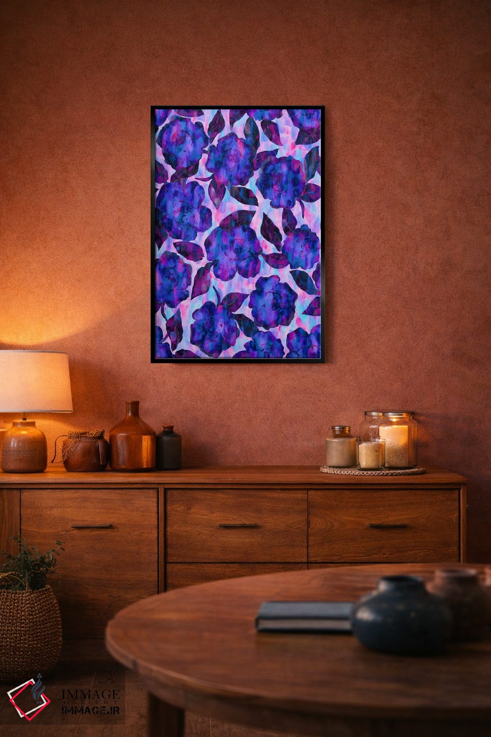 براساس پالت ترکیبی اثر، قاب تیک گرم (چوبی) پیشنهاد اول است و مشکی مات (فریم متوسط) مکمل. برای سفارشهای پروژهای با ابعاد و قابهای اختصاصی با ایماژ در تماس باشید.