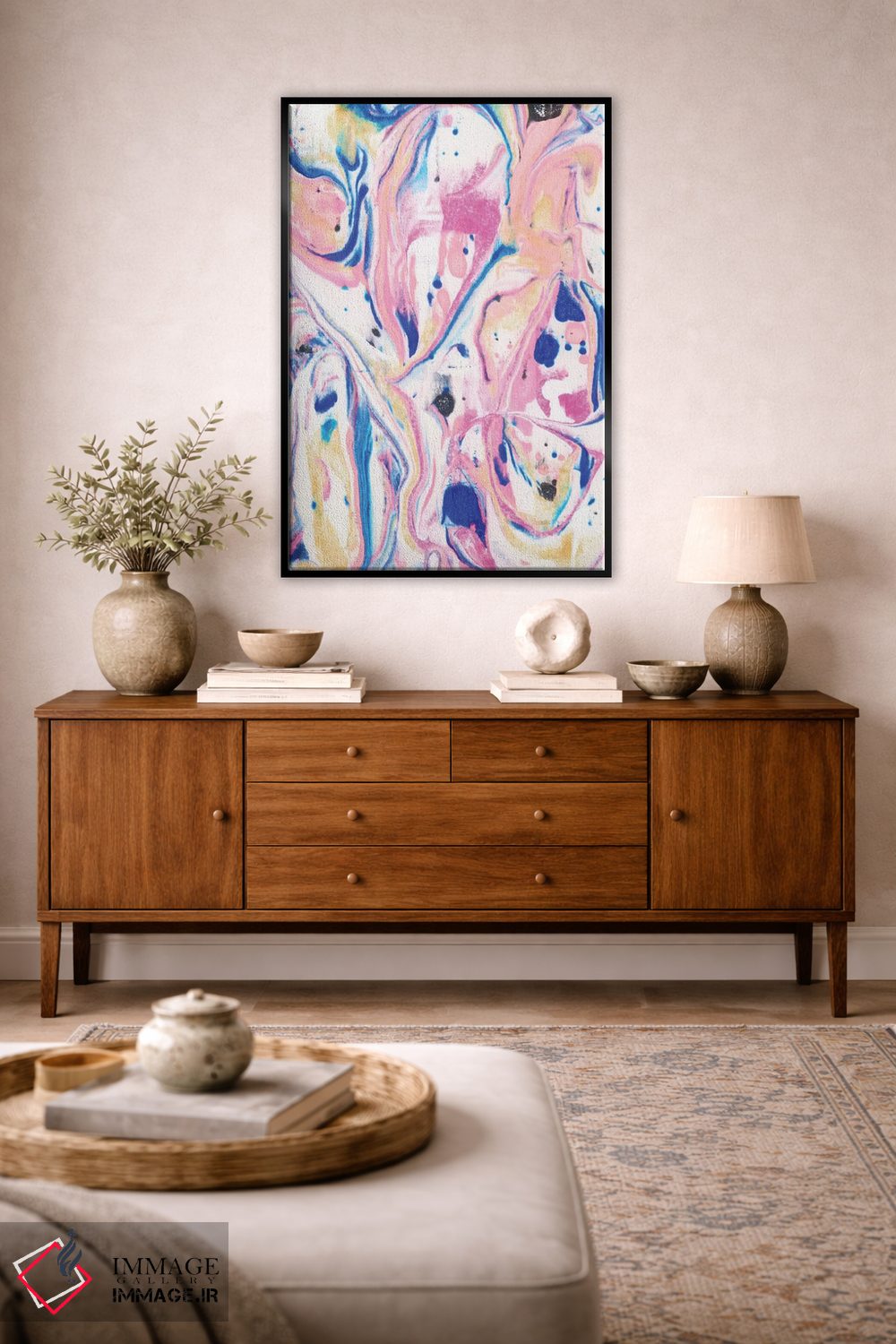 براساس پالت ترکیبی اثر، قاب تیک گرم (چوبی) پیشنهاد اول است و مشکی مات (فریم متوسط) مکمل. برای سفارشهای پروژهای با ابعاد و قابهای اختصاصی با ایماژ در تماس باشید.