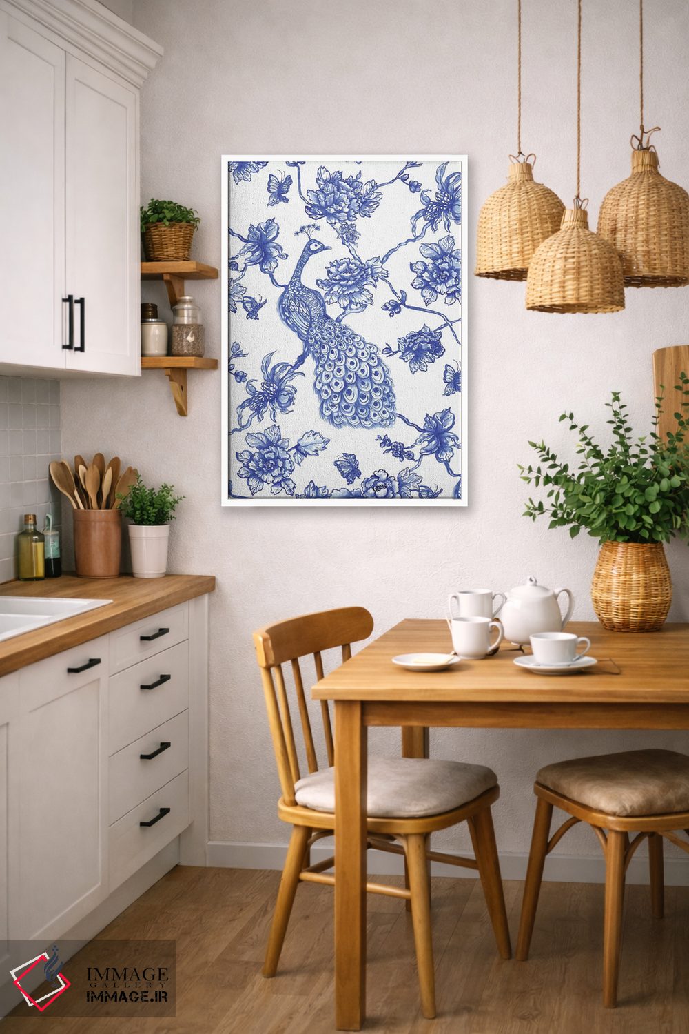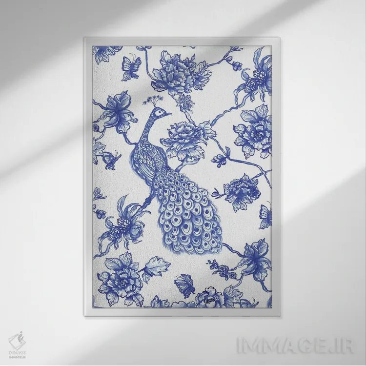 تابلو مدرن طاووس سبک چینی اثر ژاکلین مالدونادو - نمای قاب‌دار سفید