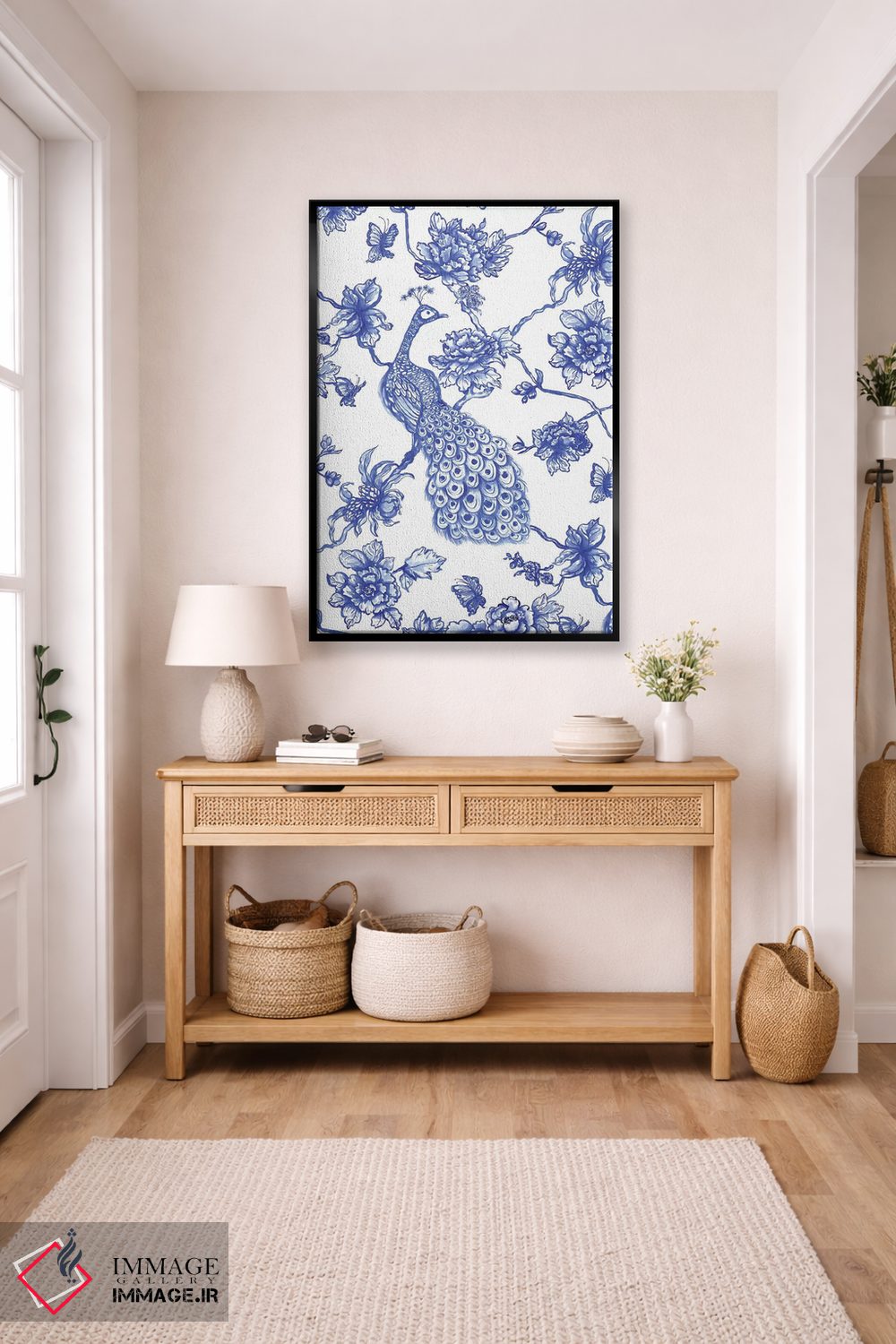 تابلو مدرن طاووس سبک چینی اثر ژاکلین مالدونادو - نمای روبه‌رو روی دیوار