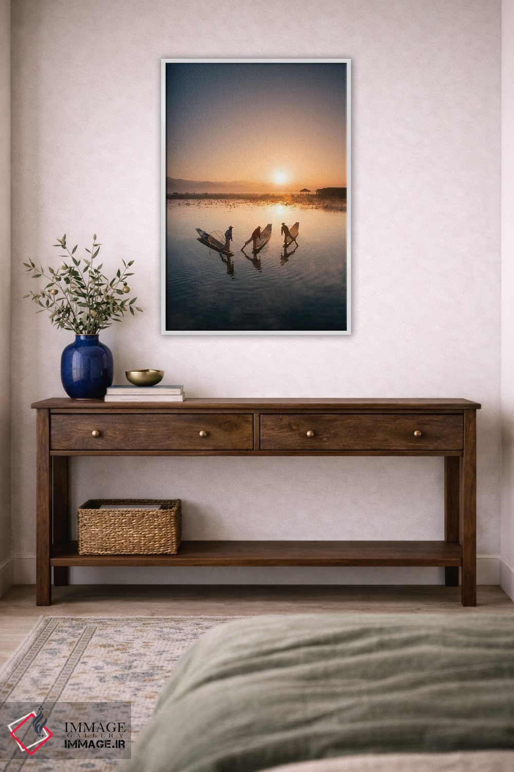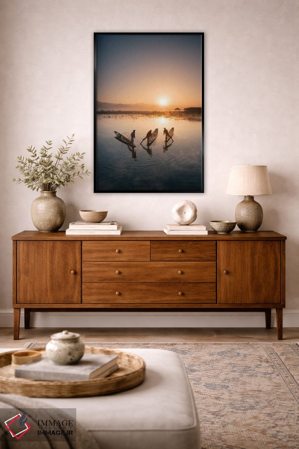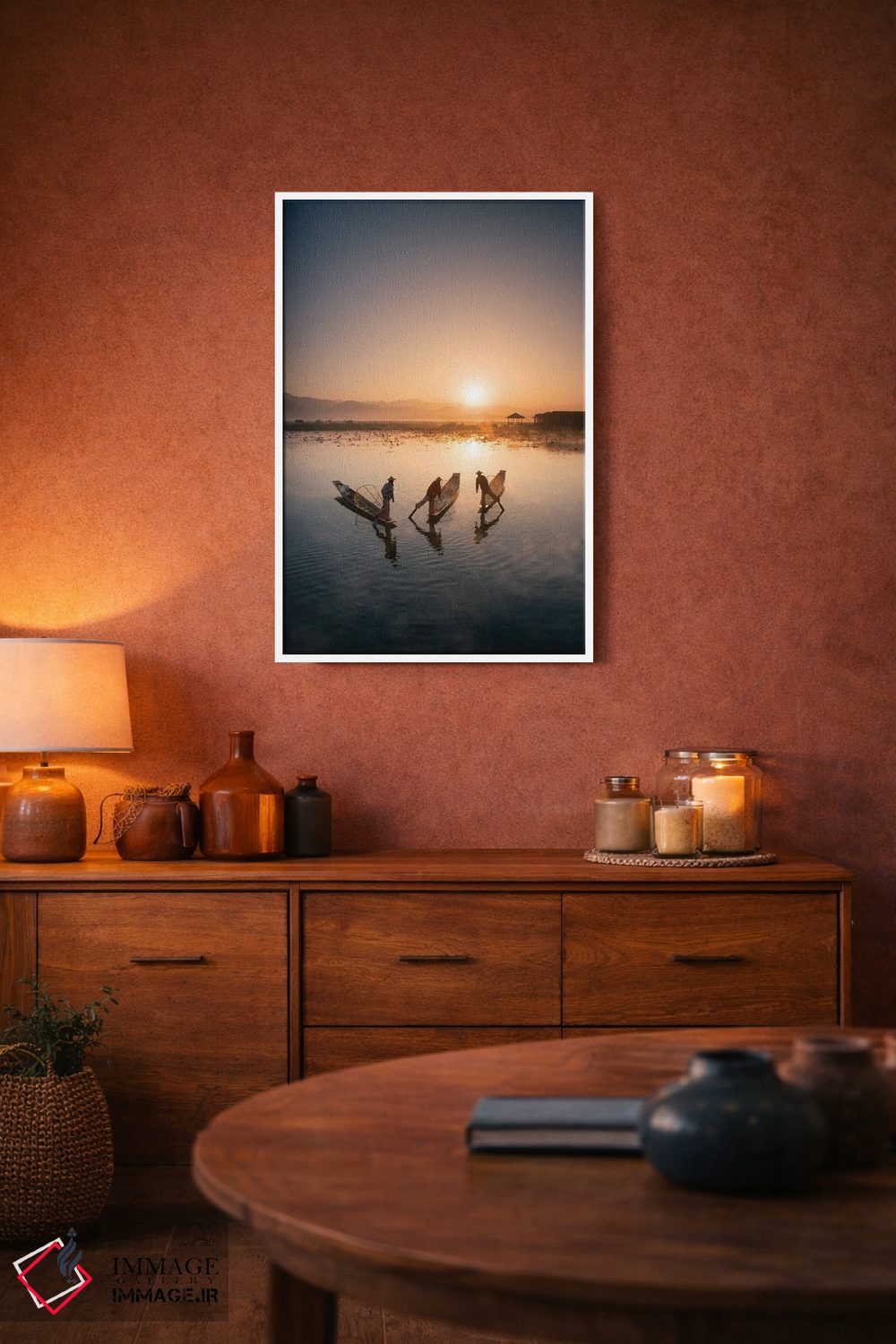 «Inle Lake، Myanmar، گروهی از ماهیگیران اینتا هنگام طلوع خورشید، دریاچه اینله، میانمار» اثرِ «یان بکه» از آن انتخابهاییست که روی دیوار، تمیز و دقیق دیده میشود؛ برای راهروها و ورودیهای مینیمال انتخابی عالی است. یک انتخاب خوشسلیقه است که با گذر زمان هم تازه میماند.