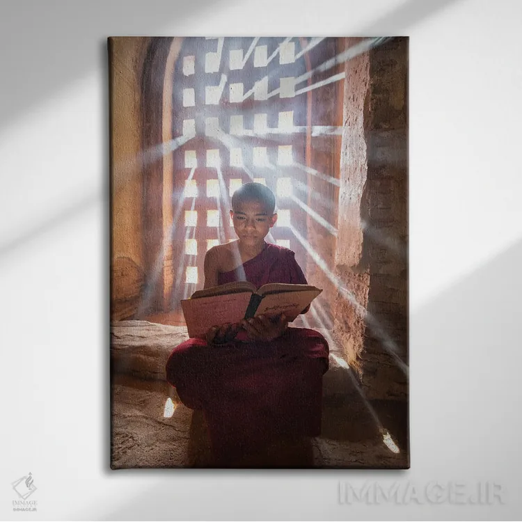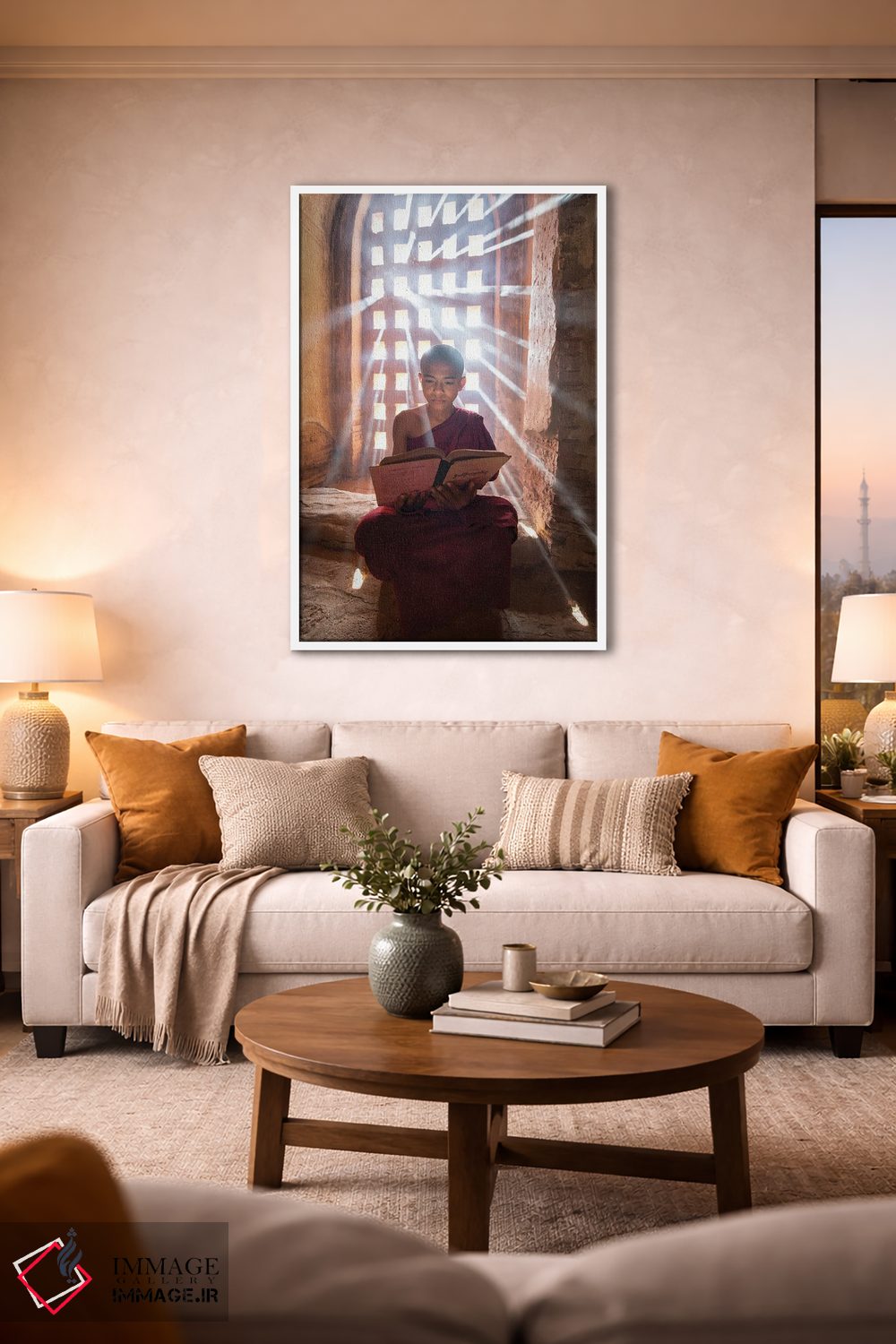 در این اثر، «Bagan، Myanmar، راهب نوآموز برمهای در حال خواندن کتاب در معبدی در باگان، میانمار» اثرِ «یان بکه» یک «نقطهٔ مکث» خوشسلیقه میسازد؛ برای دکورهای کلاسیک با چوب و پارچه پیشنهاد میشود. برای ترکیب با چوب، سنگ یا فلز، انتخابی دقیق است.