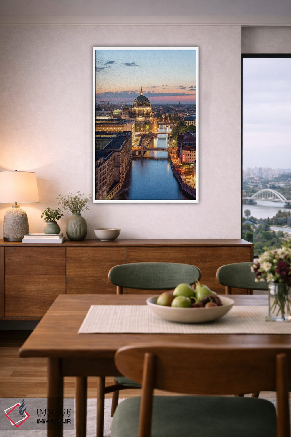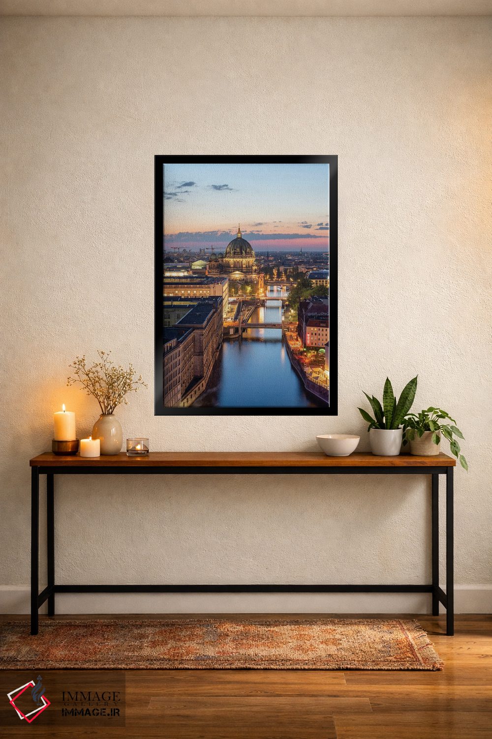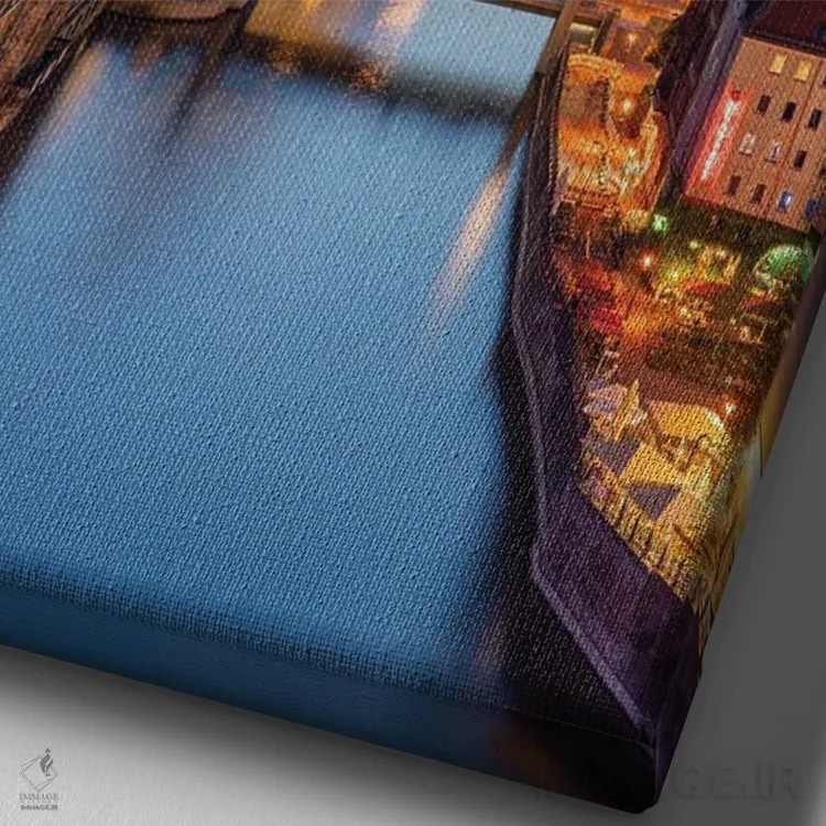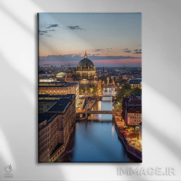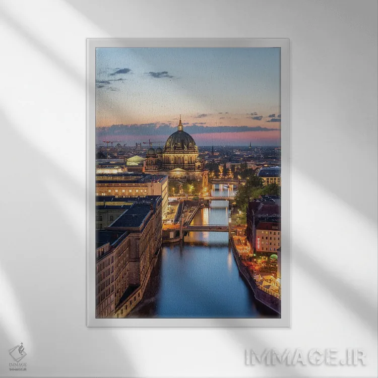 اگر دیوارِ خانهتان به یک منظرهی نفسکش نیاز دارد، «Berlin، Germany، نمای هوایی از کلیسای جامع برلین و رودخانه اشپری در شب، برلین، آلمان» اثرِ «یان بکه» با حالوهوای این اثر انتخاب خوبیست.