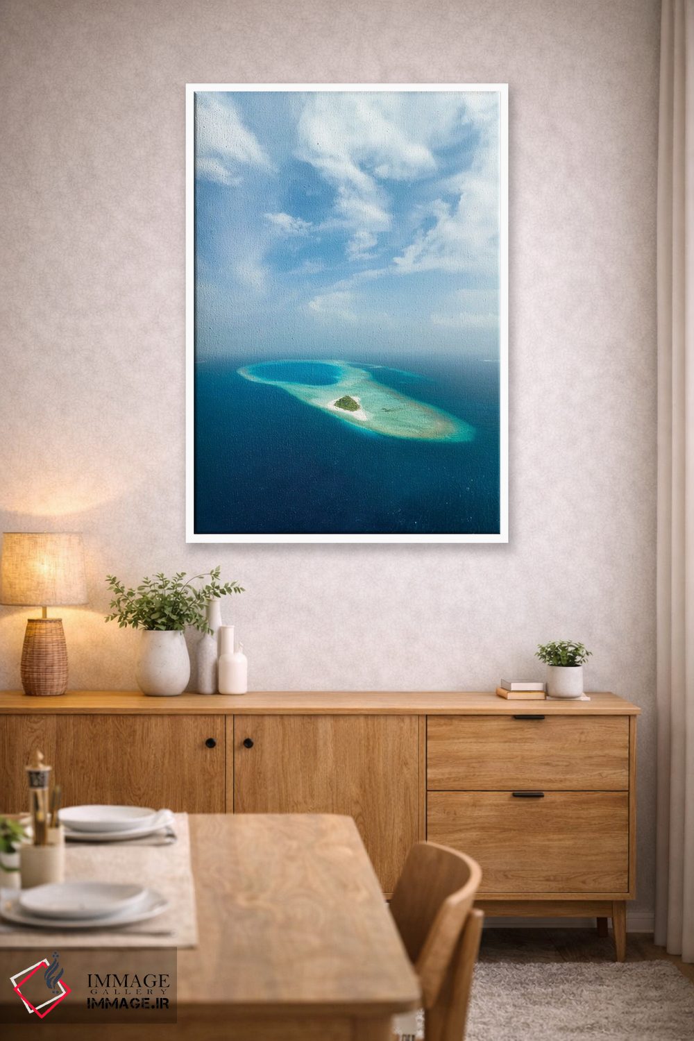 برای دیواری که دوست دارید «حرف داشته باشد»، «Baa Atoll، Maldives، نمای هوایی از خلیج حنیفارو، آتول با، مالدیو» اثرِ «یان بکه» دیوار را از تزئین به «حضور» تبدیل میکند؛ برای فضاهای کمنور که به «نقطهٔ روشن» نیاز دارند پیشنهاد میشود. با مبلمان خنثی، تضاد دلنشینی میسازد.