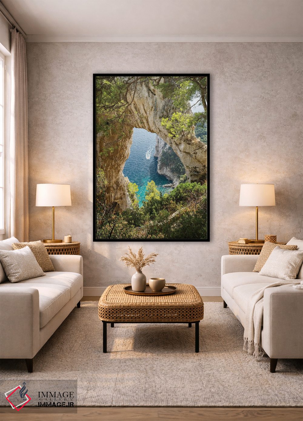 «Italy، طاق طبیعی در جزیره کاپری، ایتالیا» اثرِ «یان بکه» میتواند جلوهٔ دیوار را منسجمتر کند؛ برای کنار کتابخانه یا میز کار پیشنهاد میشود. به دیوار حس «تمامشده» میدهد.