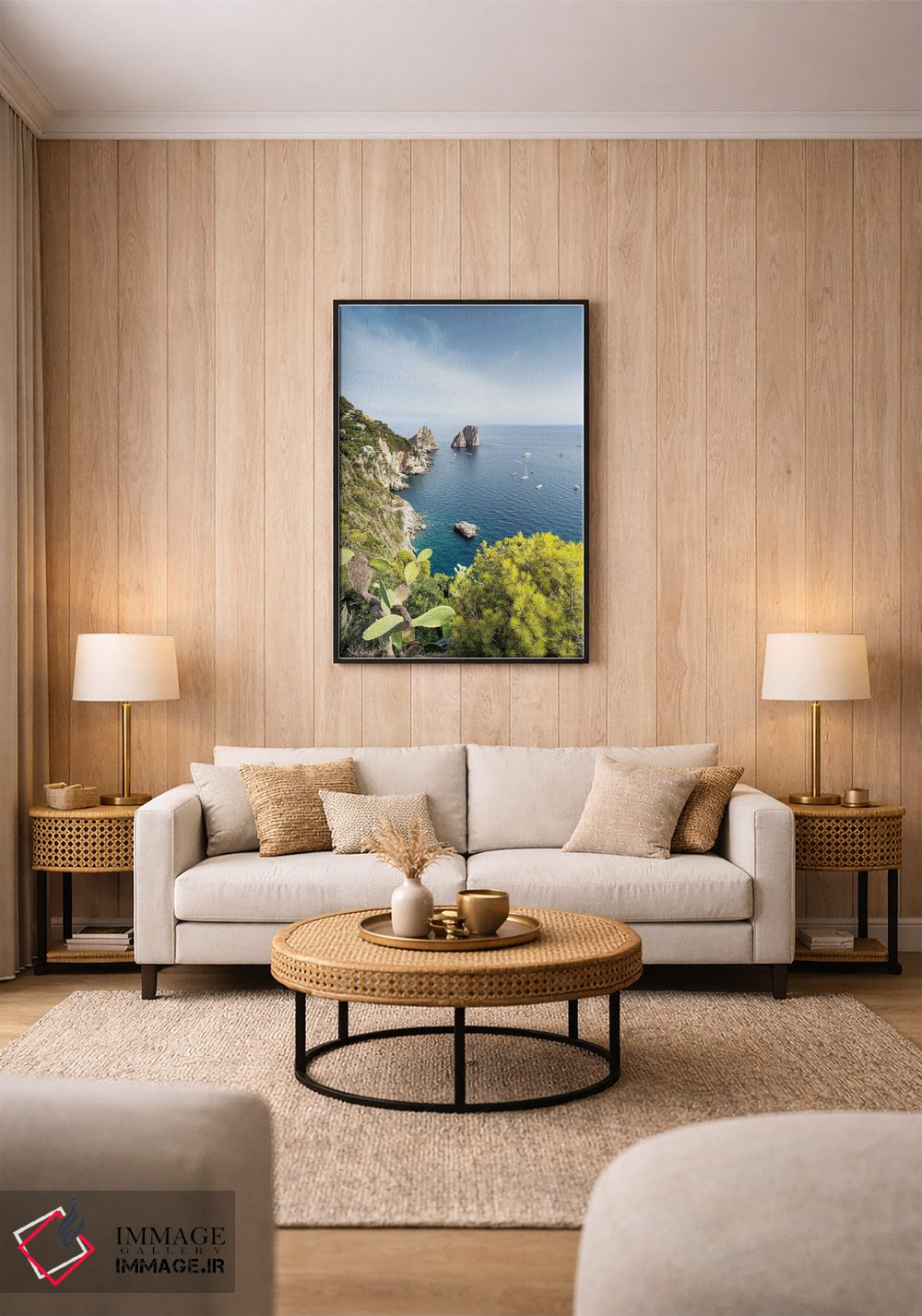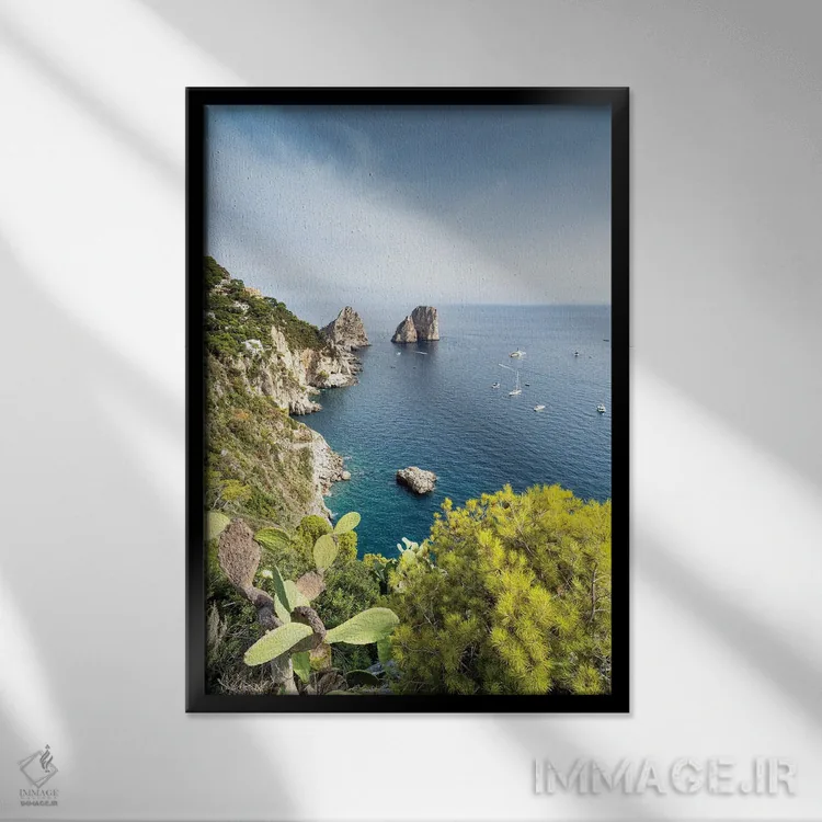 «Capri Island، Italy، صخرههای فاراگلیونی از باغهای آگوستوس، جزیره کاپری، ایتالیا» اثرِ «یان بکه» میتواند یک «نقطهٔ مکث» خوشسلیقه بسازد؛ برای فضاهای مدرن با خطوط ساده پیشنهاد میشود. در چیدمانهای مختلف، هماهنگپذیر و انعطافدار است.