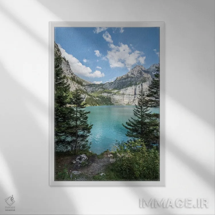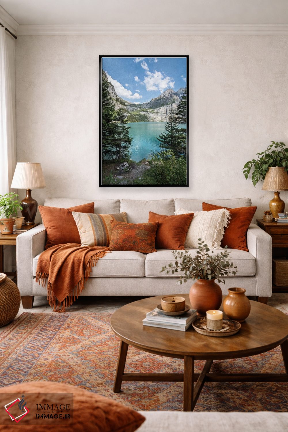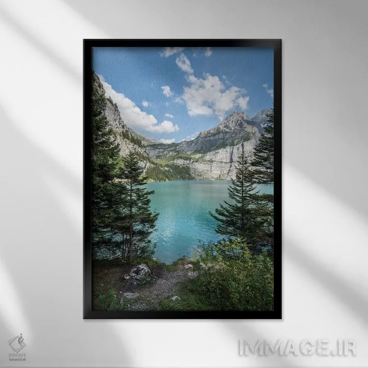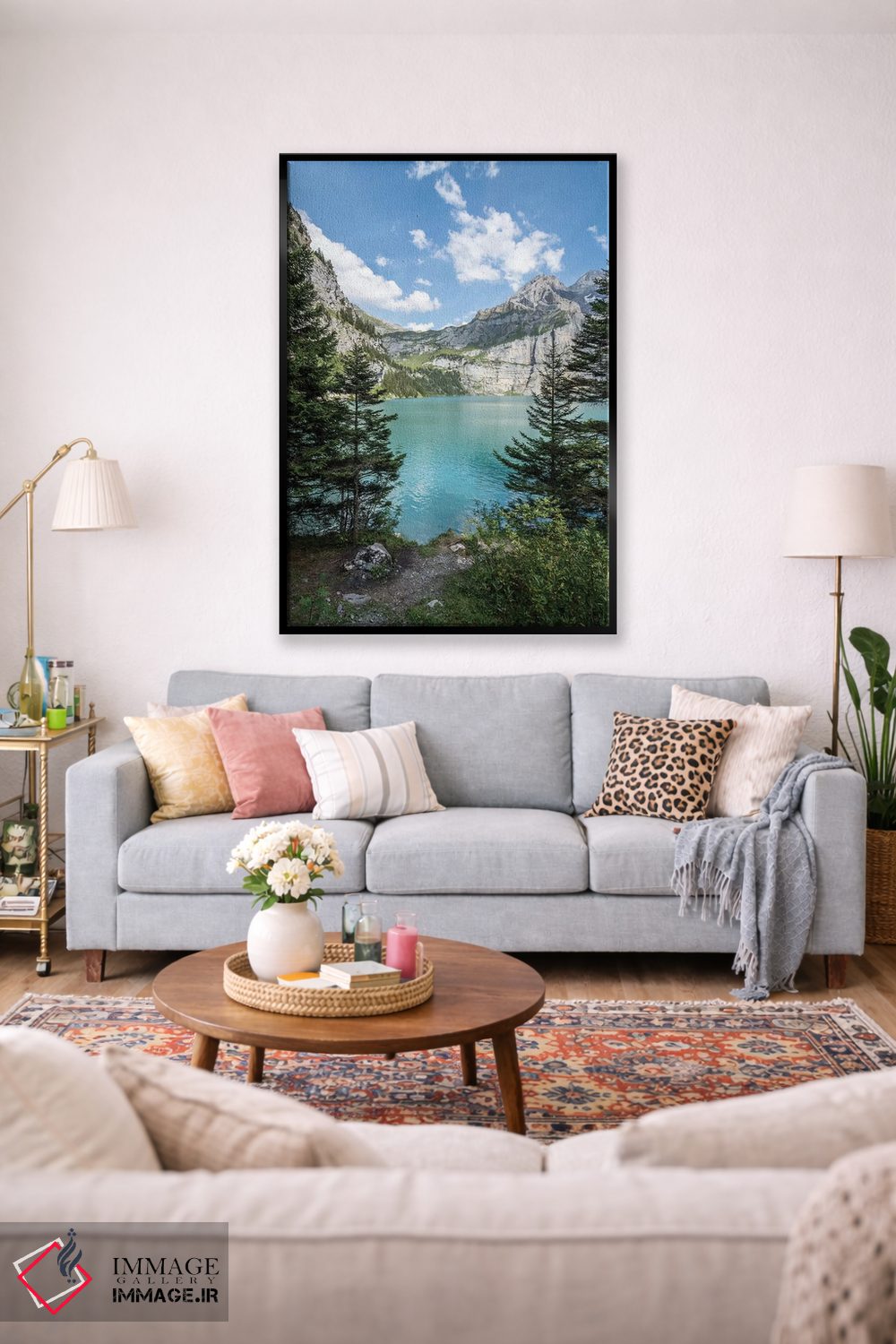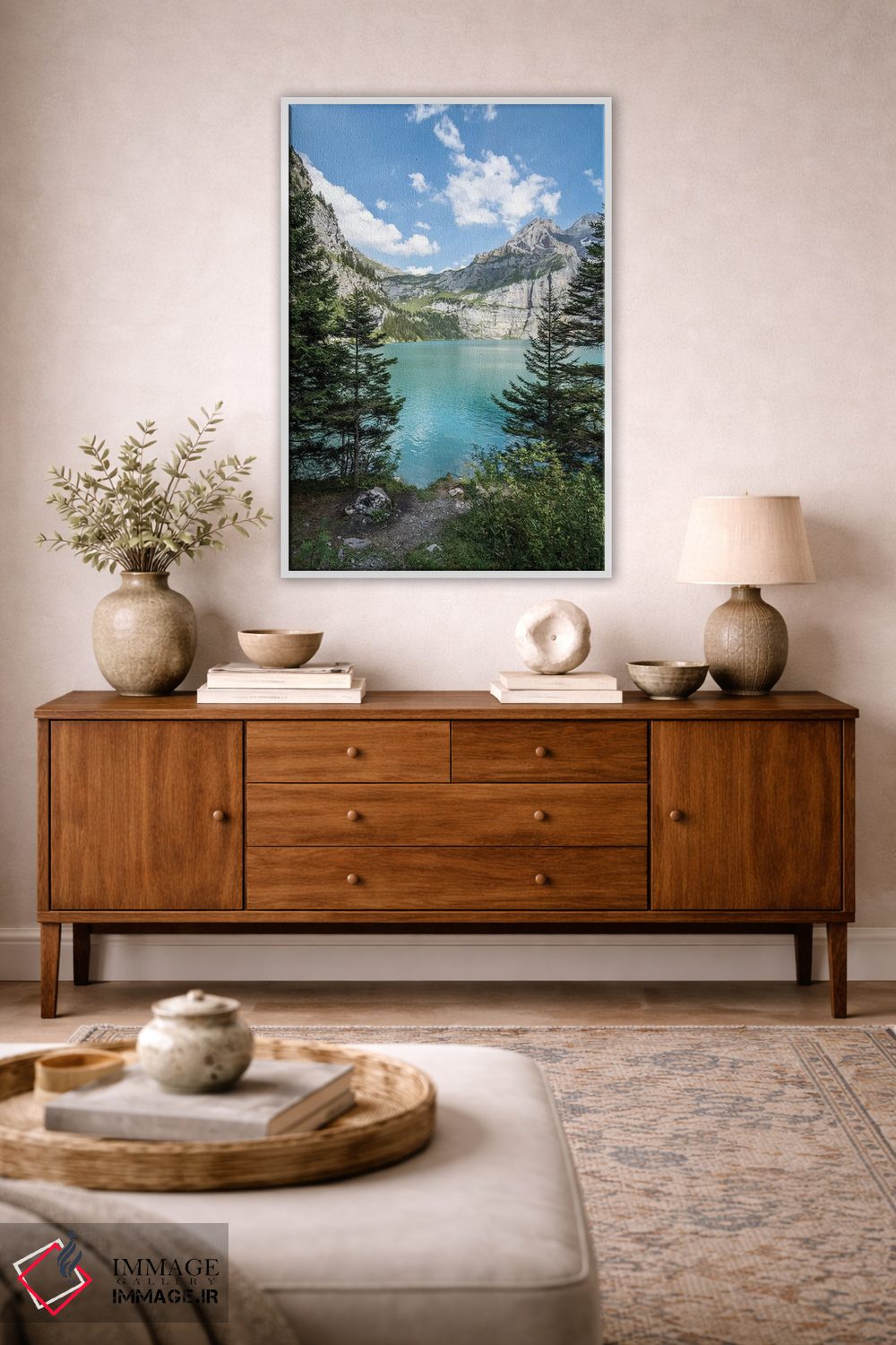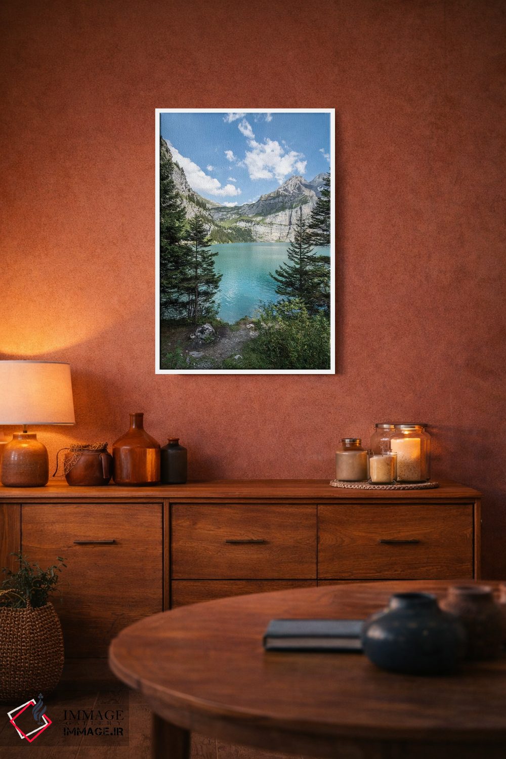 برای دیواری که دوست دارید «حرف داشته باشد»، «دریاچه اوشینن در کوههای آلپ سوئیس» اثرِ «یان بکه» یک حس «تمامشده و پرداختشده» ایجاد میکند؛ برای فضاهایی که میخواهید مرکز توجه داشته باشند پیشنهاد میشود. جزئیاتش نزدیکِ کار هم ارزش نگاه دارد.