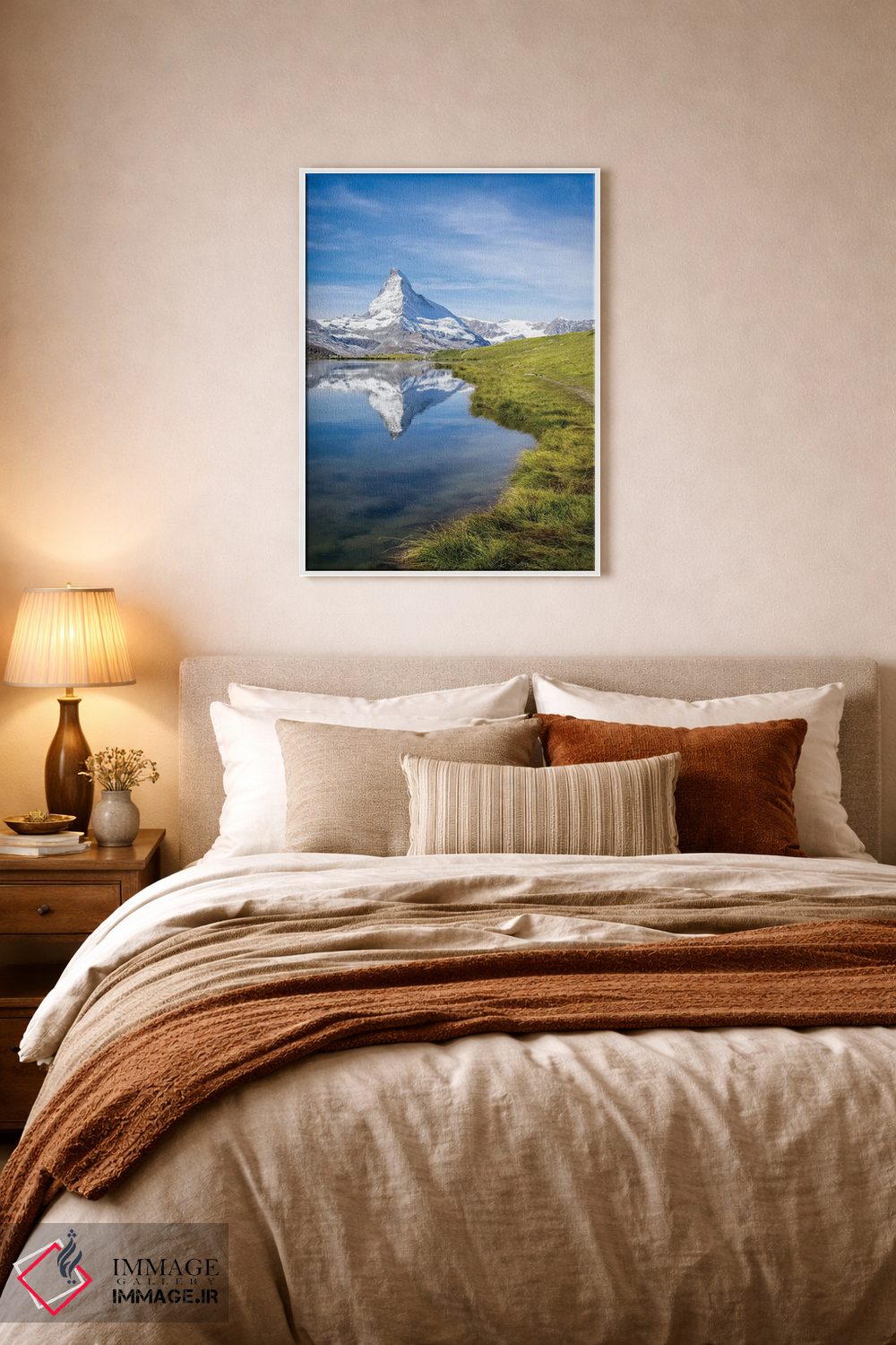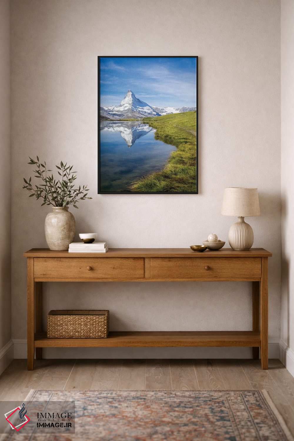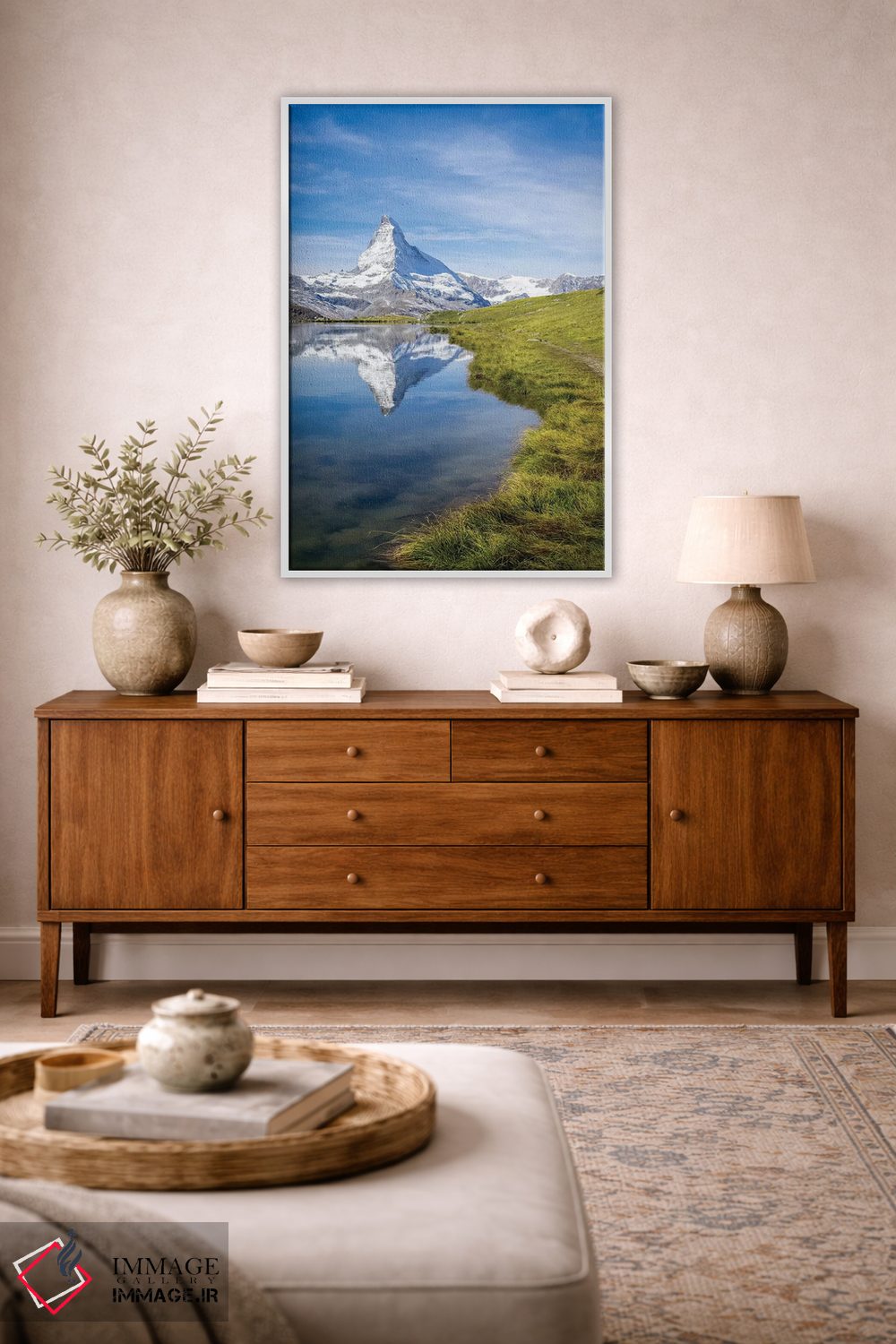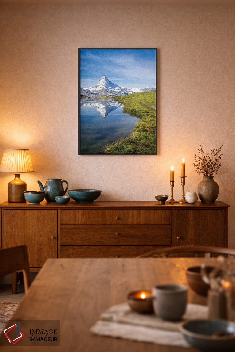 وقتی چیدمان را با دقت میچینید، «دریاچه استلی و ماترهورن در تابستان» اثرِ «یان بکه» فضا را روشنتر و زندهتر نشان میدهد؛ برای دکورهای کلاسیک با چوب و پارچه پیشنهاد میشود. با مبلمان خنثی، تضاد دلنشینی میسازد.
