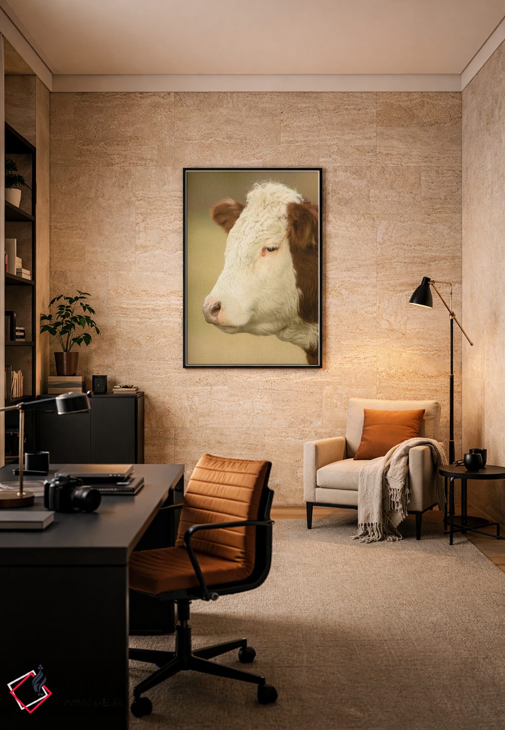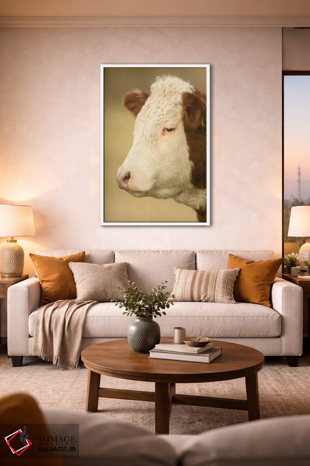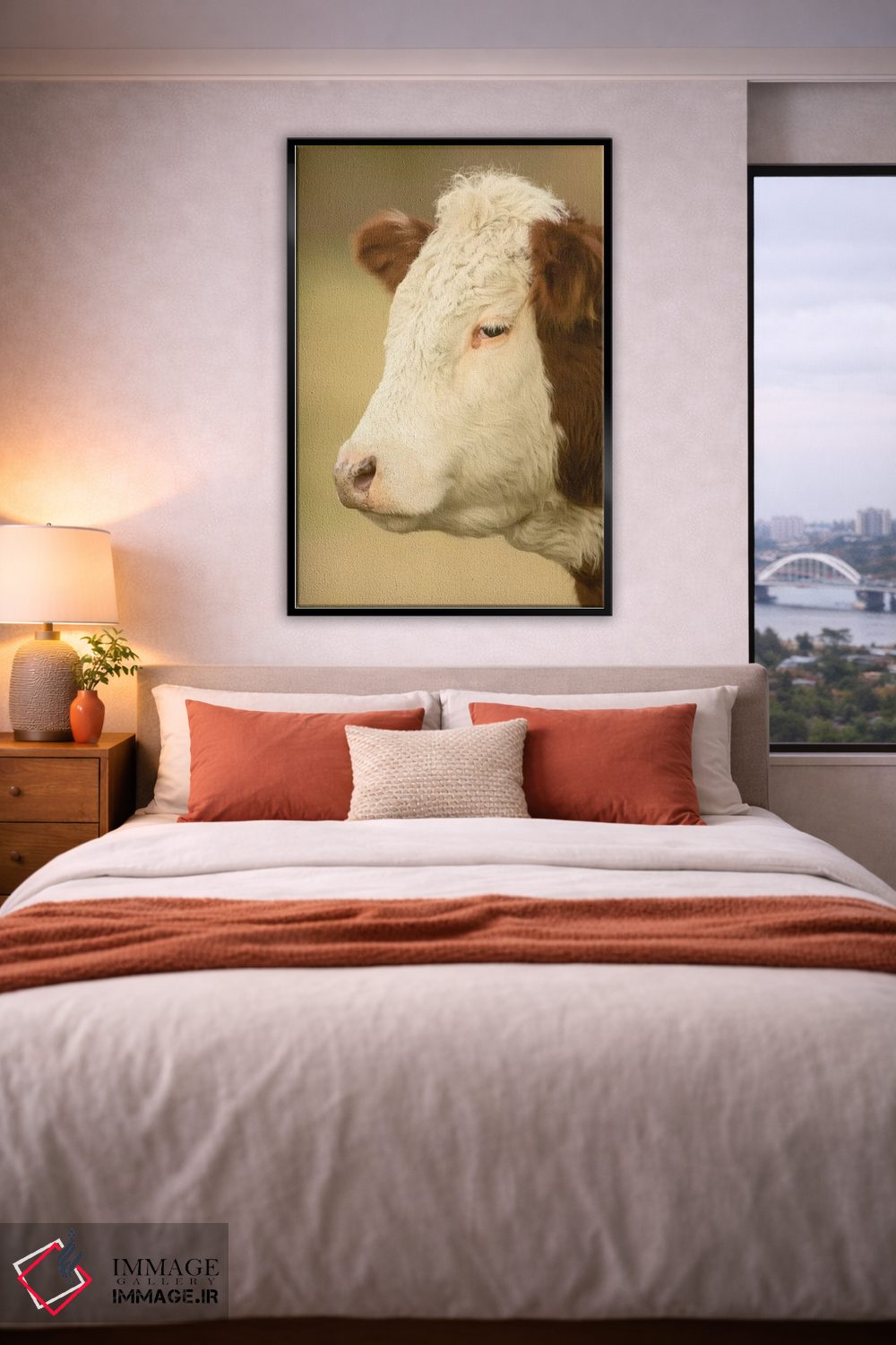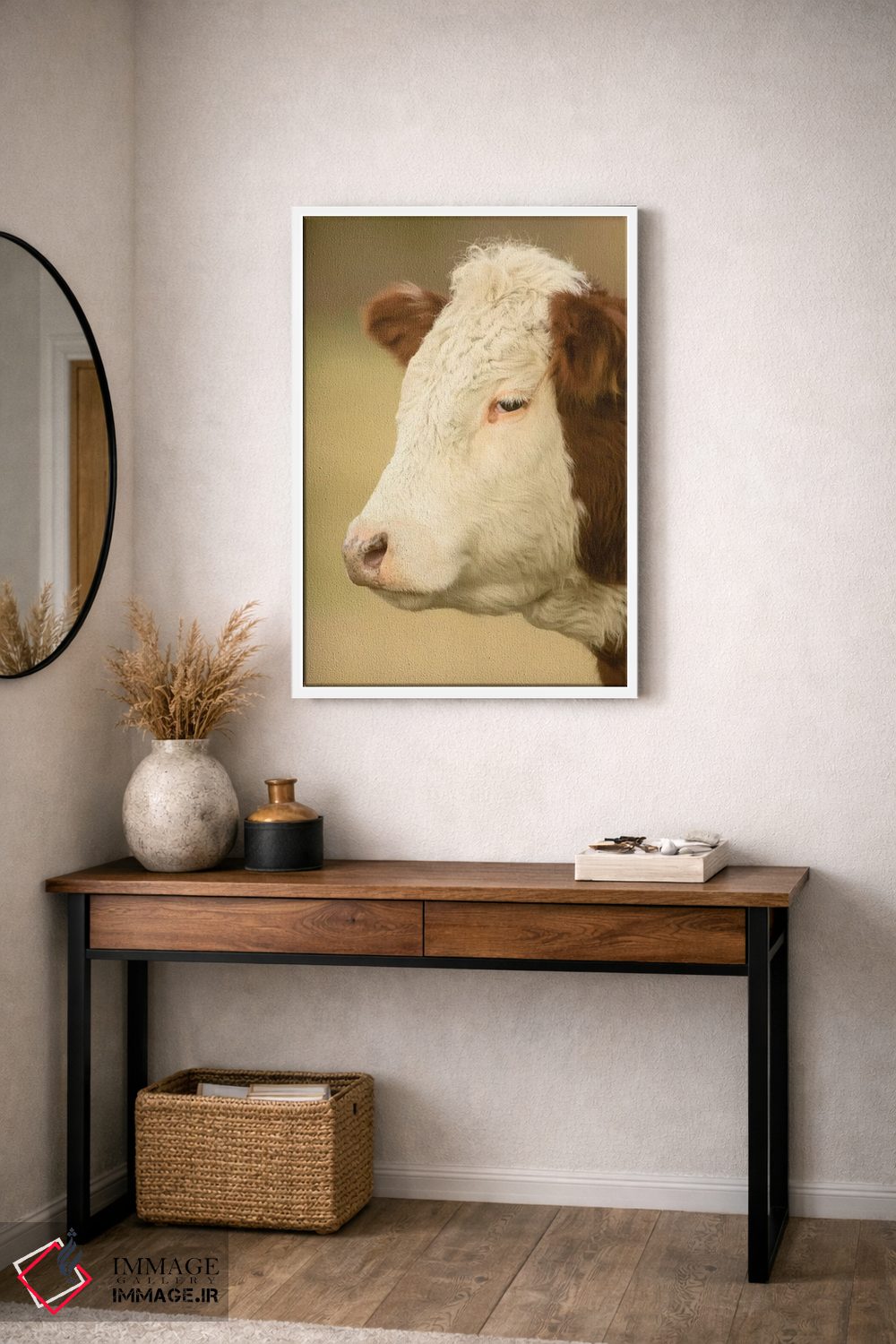 برای دیواری که دوست دارید «حرف داشته باشد»، «La Conner، Washington، USA، نمای نزدیک از گاو هرفورد در چراگاه، لا کانر، واشنگتن» اثرِ «جنت هورتون» به چیدمان، عمق و وقار میدهد؛ برای دکورهای کلاسیک با چوب و پارچه پیشنهاد میشود. در کنار قاب مناسب، جلوهٔ کار چند برابر میشود.