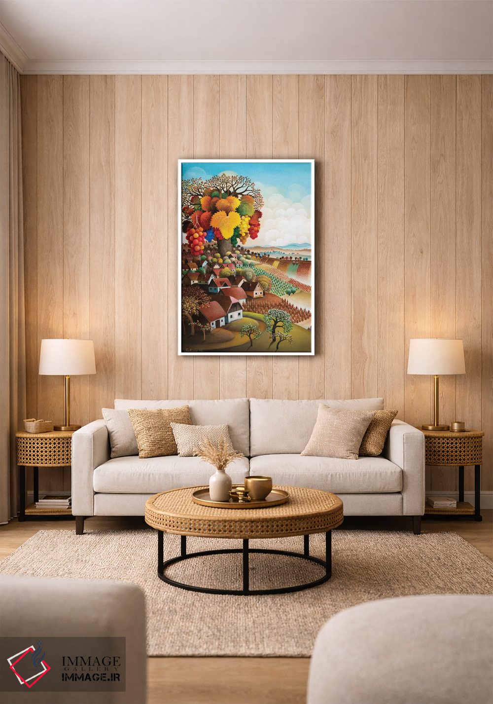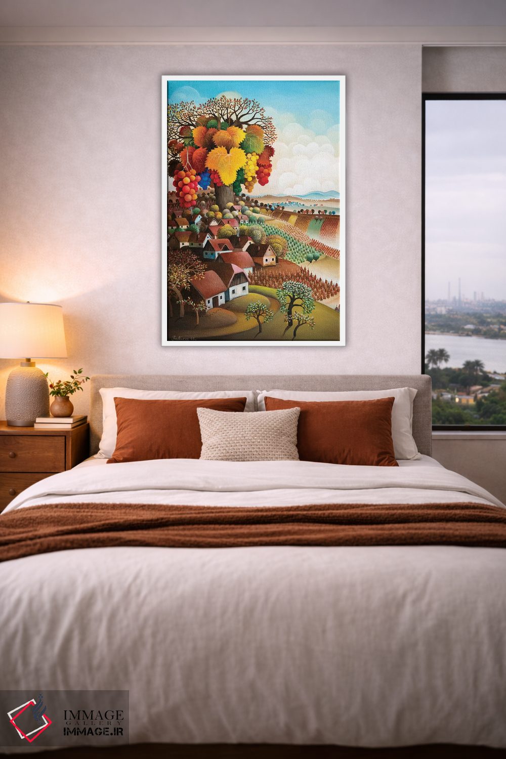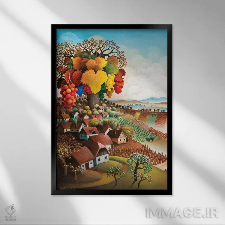 براساس پالت ترکیبی اثر، قاب تیک گرم (چوبی) پیشنهاد اول است و مشکی مات (فریم متوسط) مکمل. برای سفارشهای پروژهای با ابعاد و قابهای اختصاصی با ایماژ در تماس باشید.