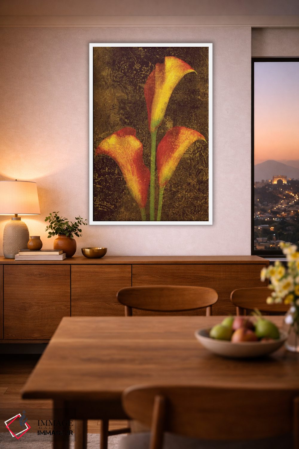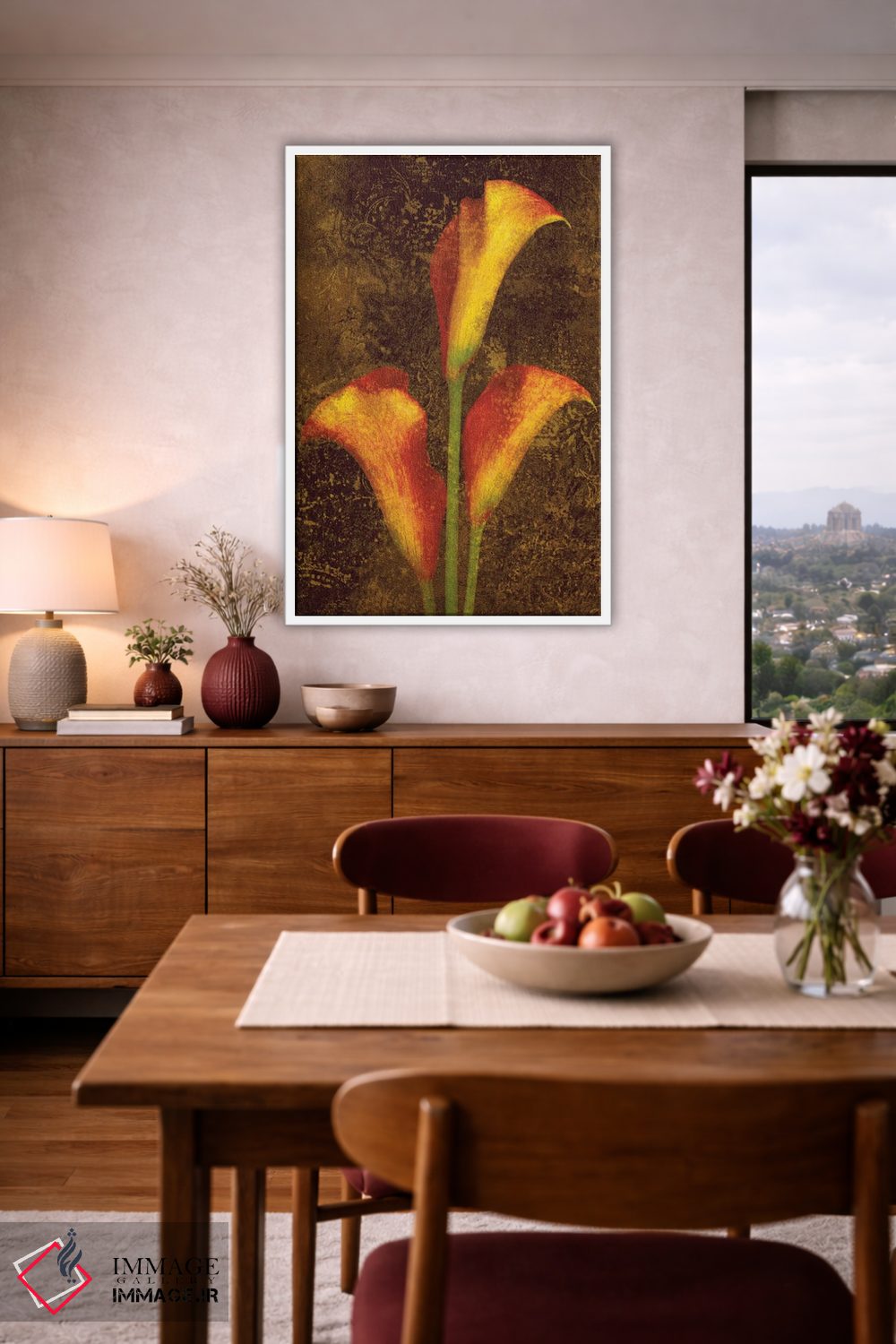 برای اتاق خواب و نشیمنهای آرام، «کالاس (نوعی گل)» اثرِ «جان سبا» تعادل رنگیِ لطیفی به چیدمان میدهد؛ برای راهروهای مینیمال انتخابی خوشسلیقه است. با قاب روشن یا چوبی، حس طبیعیتری پیدا میکند.