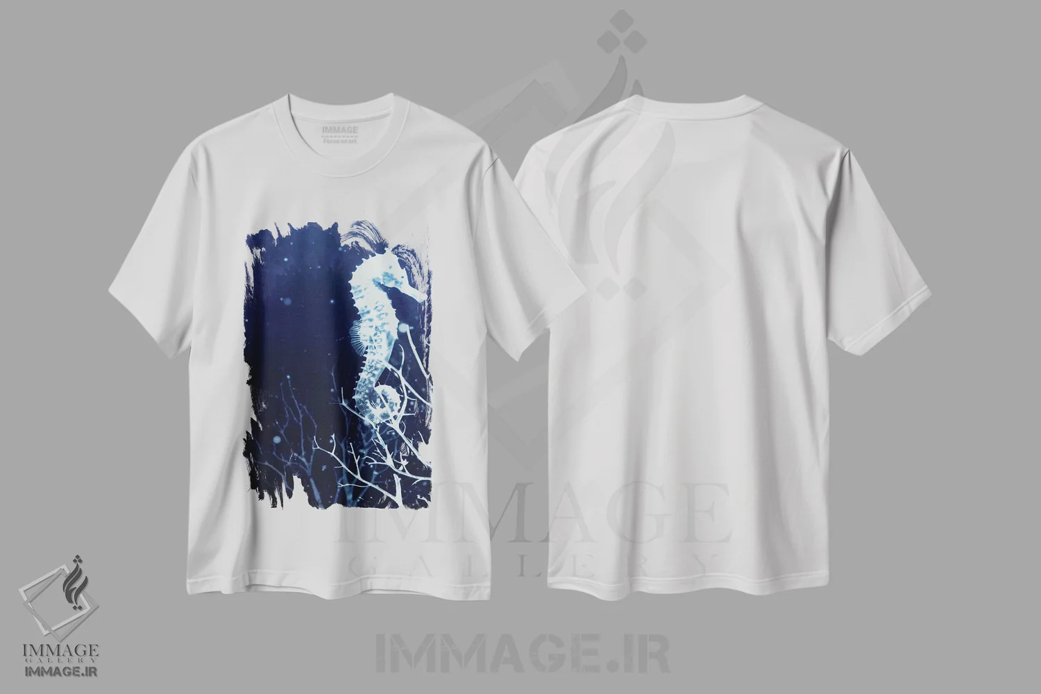 تیشرت سفید طرح دار اسب دریایی نیلی، دکور ساحلی اثر ۳۳ استخوان شکسته | فروشگاه ایماژ