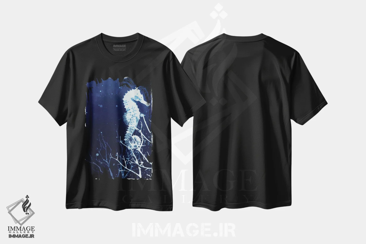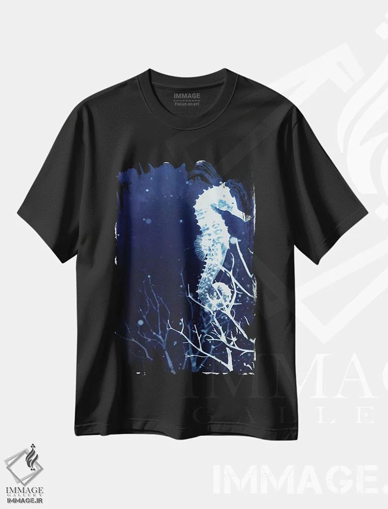تیشرت مشکی طرح دار اسب دریایی نیلی، دکور ساحلی اثر ۳۳ استخوان شکسته | immage.ir