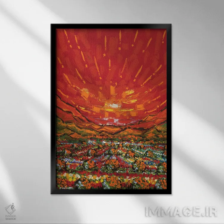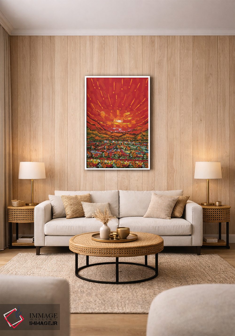 براساس پالت ترکیبی اثر، قاب تیک گرم (چوبی) پیشنهاد اول است و مشکی مات (فریم متوسط) مکمل. برای سفارشهای پروژهای با ابعاد و قابهای اختصاصی با ایماژ در تماس باشید.