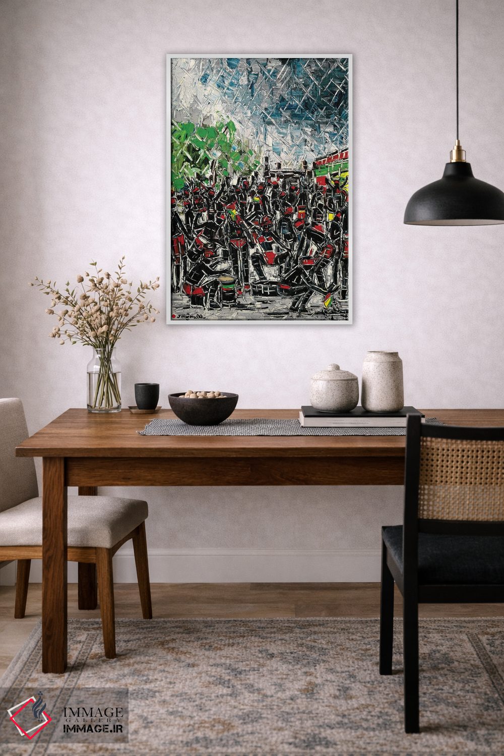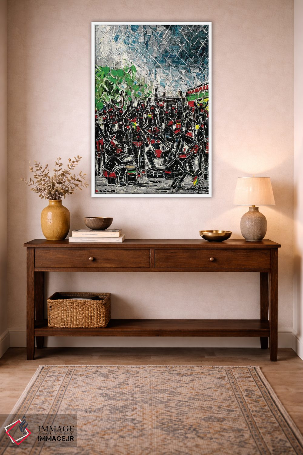 «کارناوال ژوورت (جشن کارائیبی)» اثرِ «یواخیم مکمیلان» در فضای هنری، بیشتر از روایت مستقیم، روی حس و فرم تکیه دارد؛ مناسب برای دکورهای مدرن.