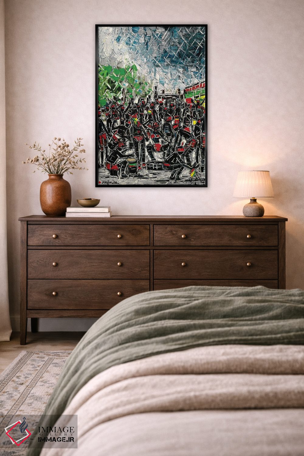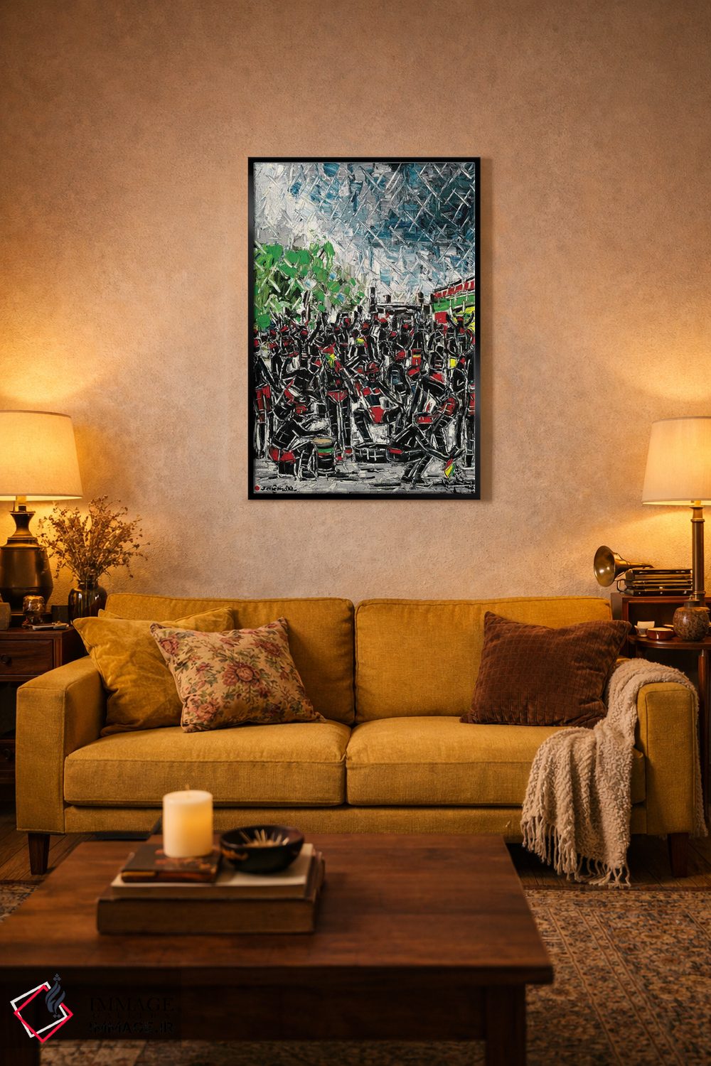 براساس پالت ترکیبی اثر، قاب تیک گرم (چوبی) پیشنهاد اول است و مشکی مات (فریم متوسط) مکمل. برای سفارشهای پروژهای با ابعاد و قابهای اختصاصی با ایماژ در تماس باشید.