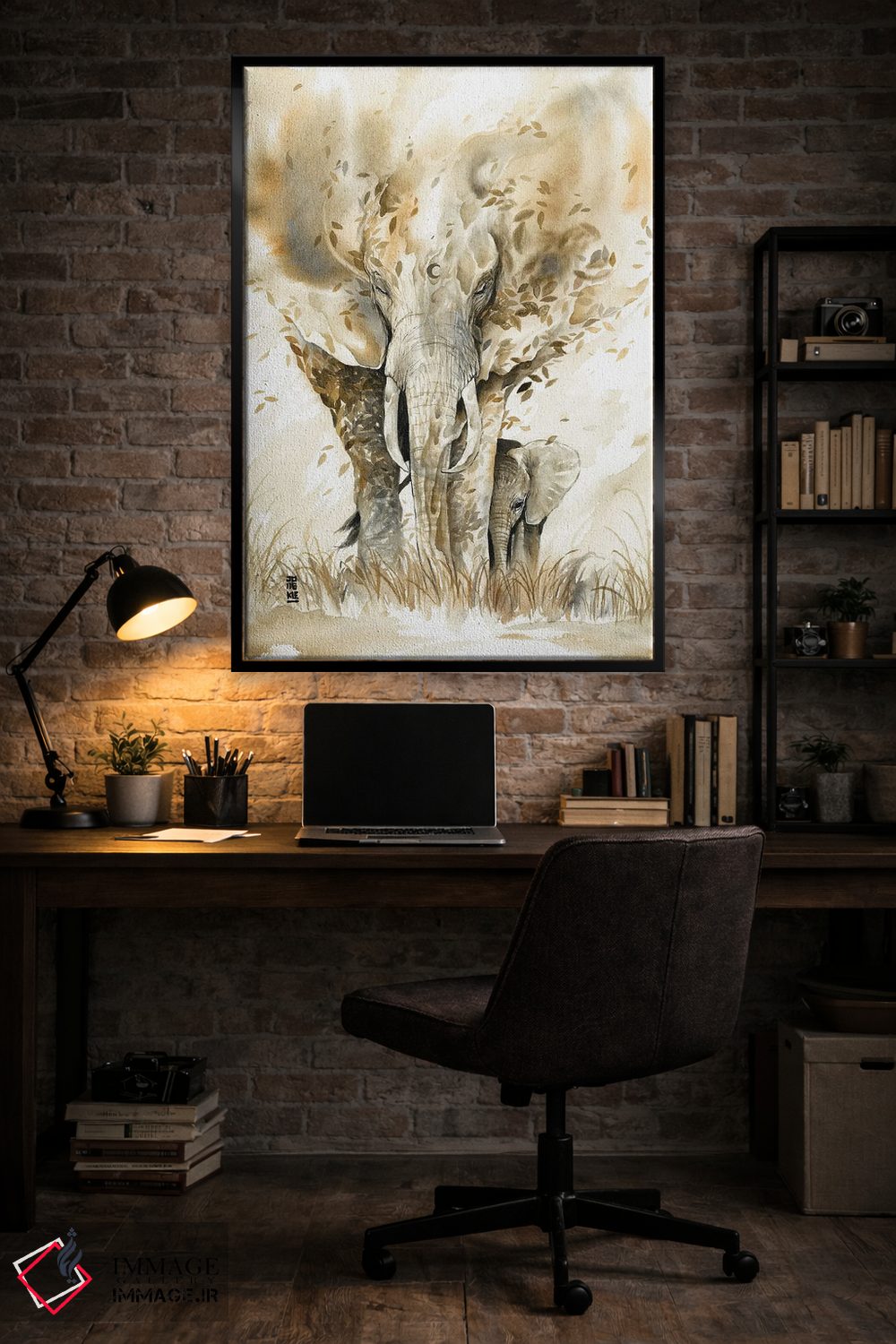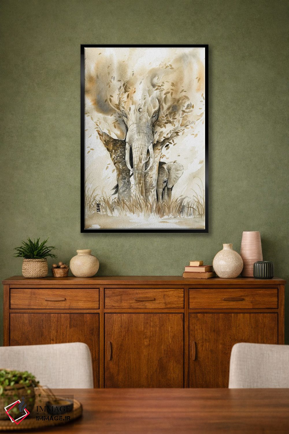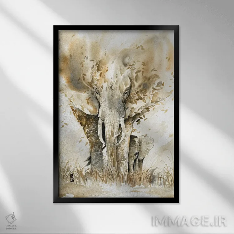 براساس پالت گرم اثر، قاب بلوط روشن (چوبی) پیشنهاد اول است و استخوانی ملایم مکمل. برای سفارشهای پروژهای با ابعاد و قابهای اختصاصی با ایماژ در تماس باشید.