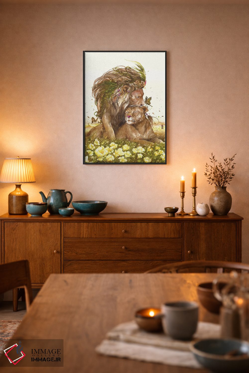 براساس پالت ترکیبی اثر، قاب تیک گرم (چوبی) پیشنهاد اول است و مشکی مات (فریم متوسط) مکمل. برای سفارشهای پروژهای با ابعاد و قابهای اختصاصی با ایماژ در تماس باشید.