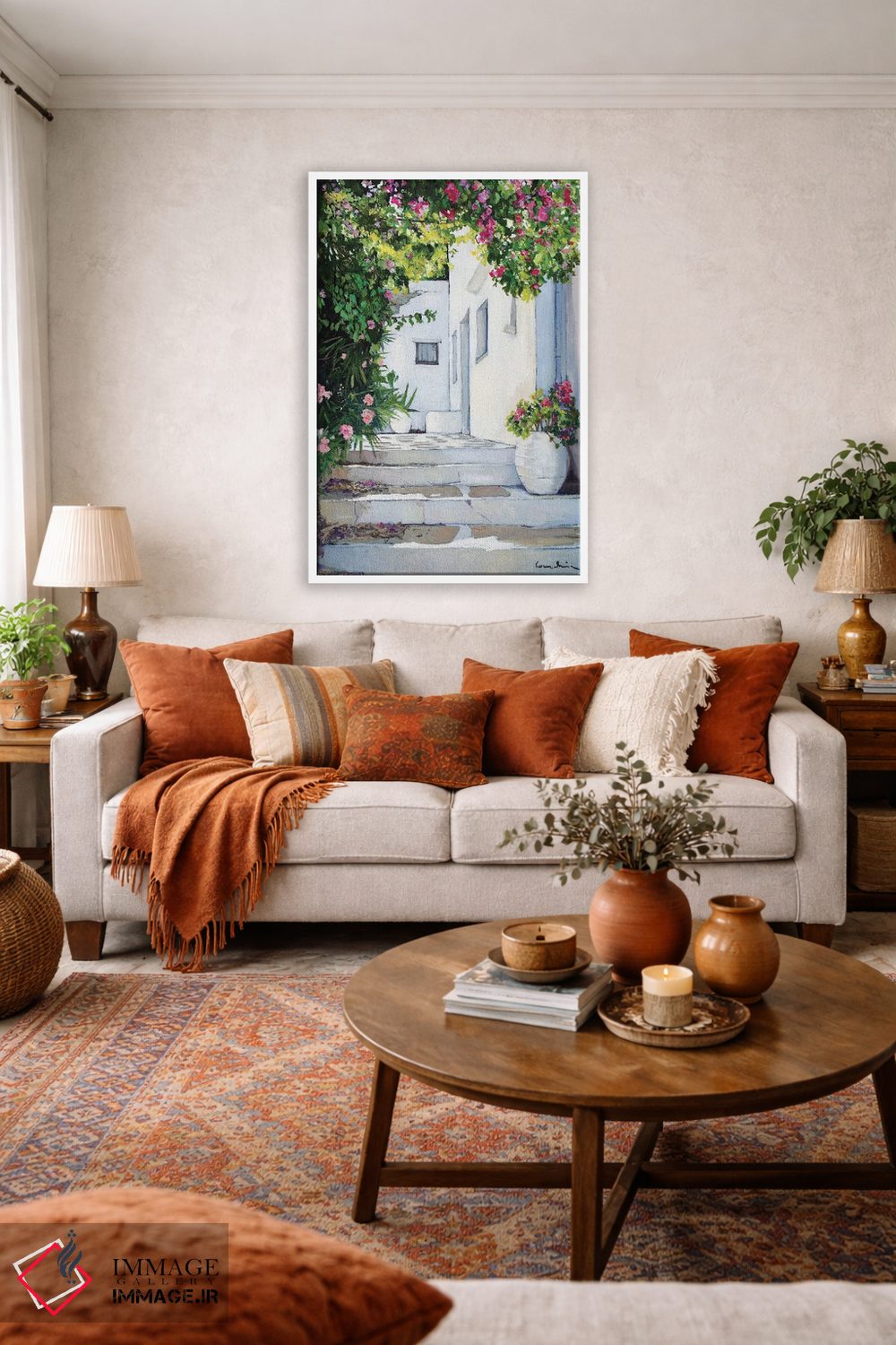 براساس پالت ترکیبی اثر، قاب تیک گرم (چوبی) پیشنهاد اول است و مشکی مات (فریم متوسط) مکمل. برای سفارشهای پروژهای با ابعاد و قابهای اختصاصی با ایماژ در تماس باشید.