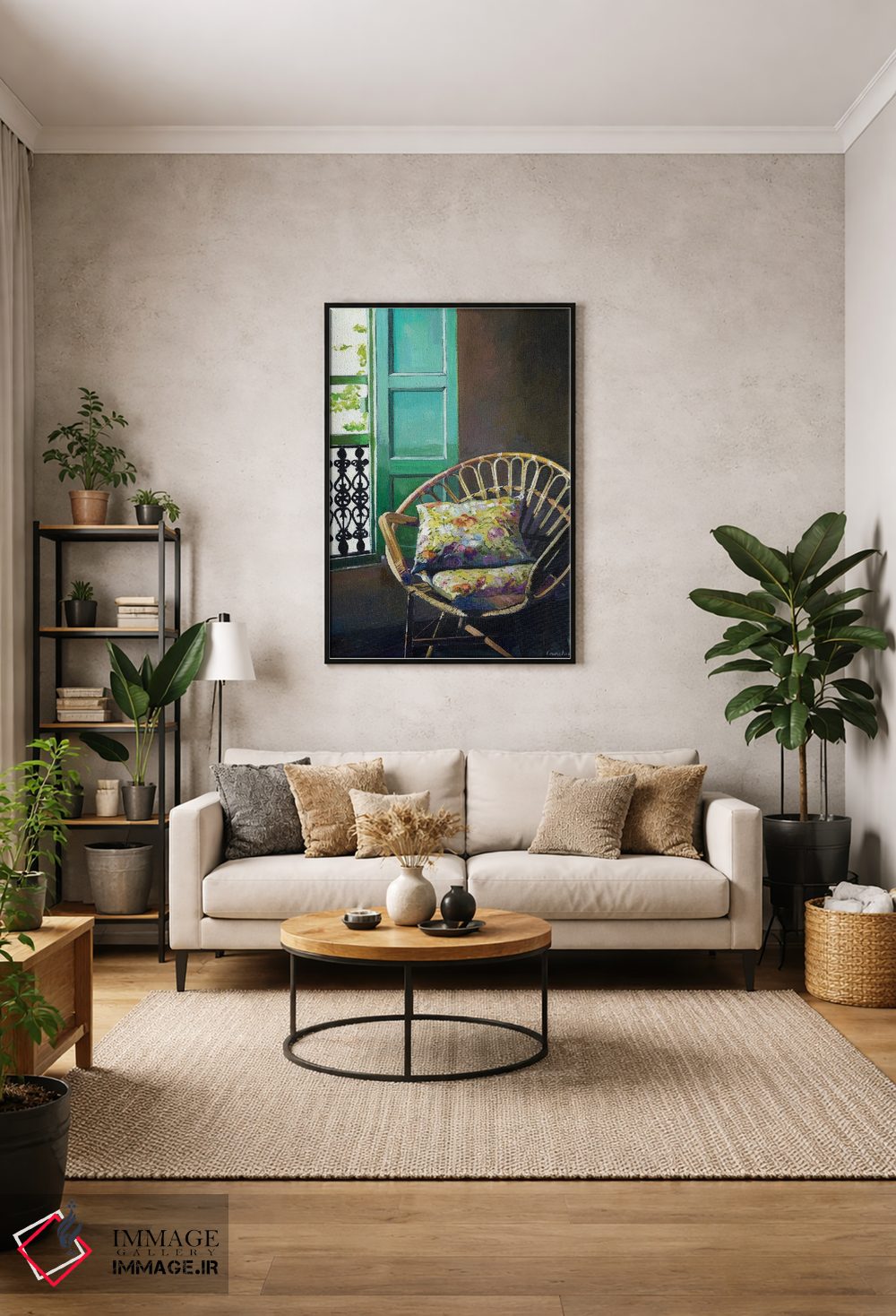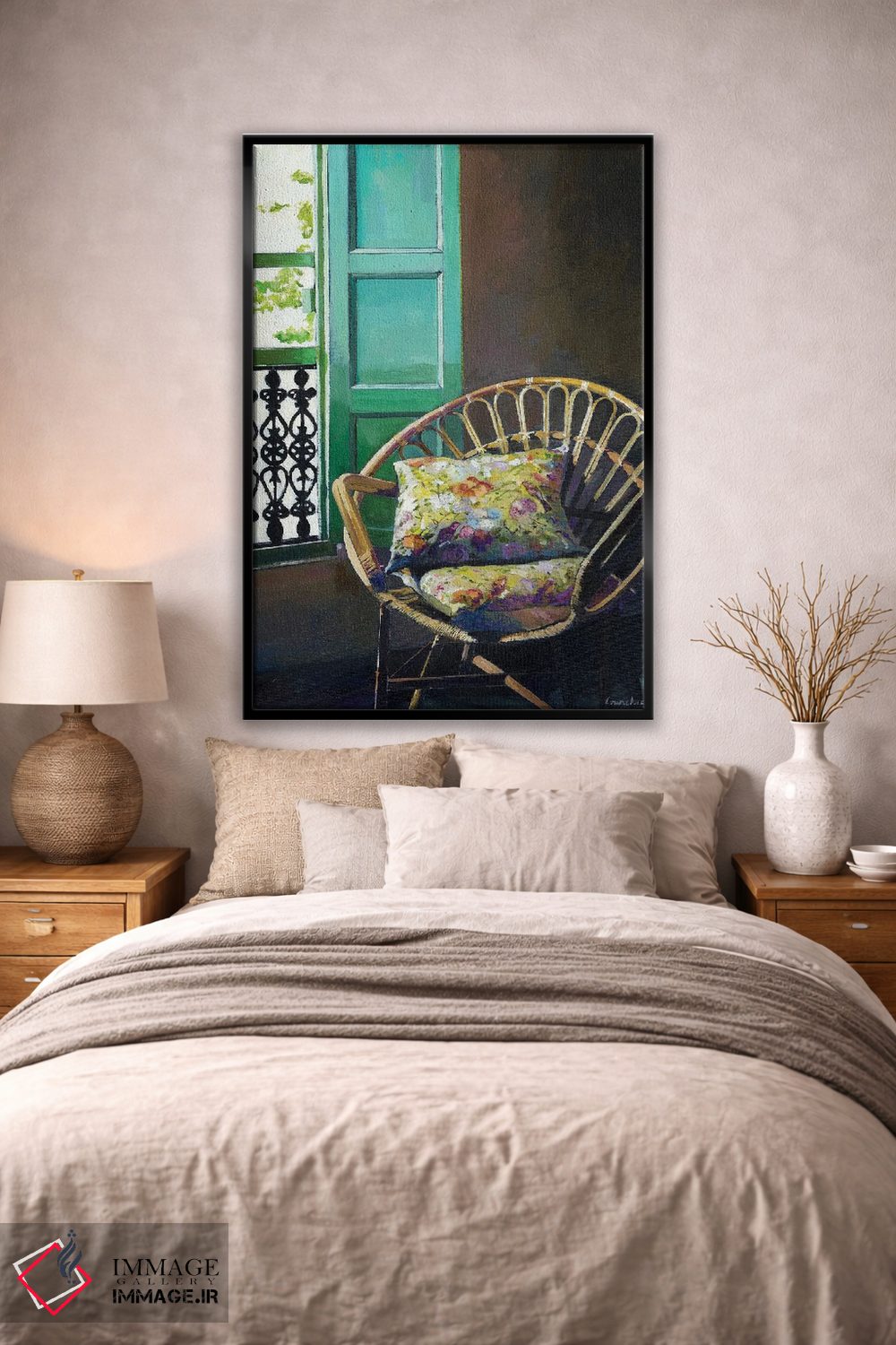 براساس پالت ترکیبی اثر، قاب بلوط روشن (چوبی) پیشنهاد اول است و استخوانی ملایم مکمل. برای سفارشهای پروژهای با ابعاد و قابهای اختصاصی با ایماژ در تماس باشید.