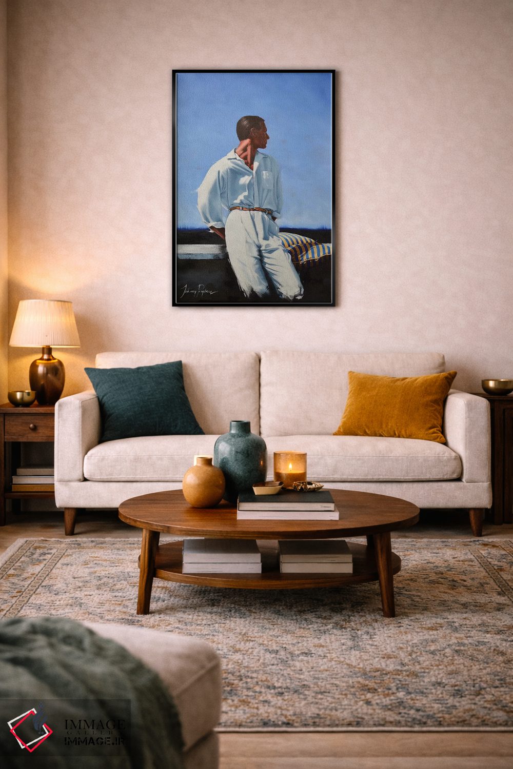 براساس پالت ترکیبی اثر، قاب تیک گرم (چوبی) پیشنهاد اول است و مشکی مات (فریم متوسط) مکمل. برای سفارشهای پروژهای با ابعاد و قابهای اختصاصی با ایماژ در تماس باشید.