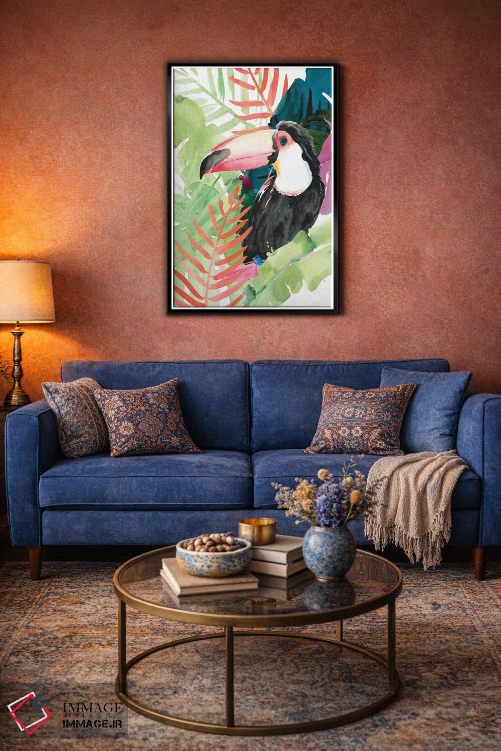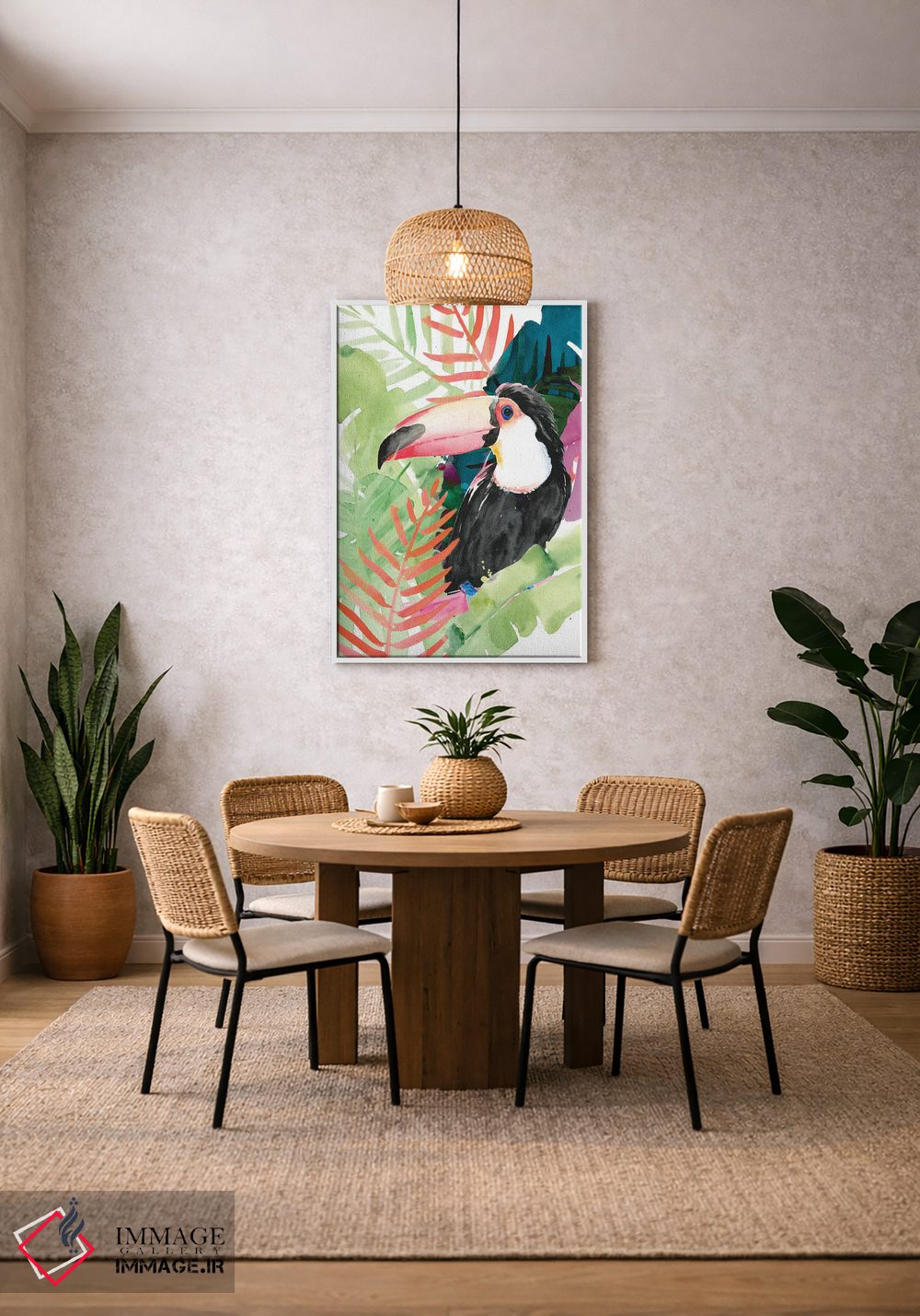 «نخلهای توکان یک» اثرِ «جنیفر پکستون پارکر» از آن کارهاییست که گرما و شخصیت به فضا اضافه میکند؛ برای خانههایی با چوب و پارچههای گرم انتخاب خوبیست. با نورپردازی نقطهای، جذابتر هم میشود.
