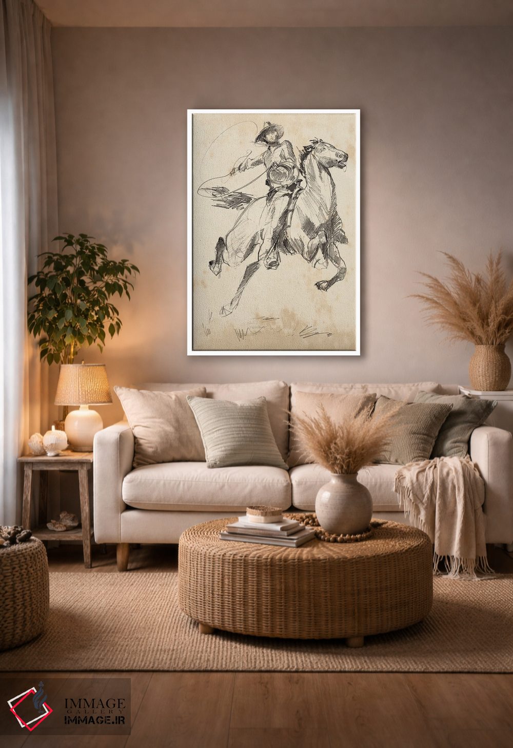 براساس پالت خنثی اثر، قاب بلوط روشن (چوبی) پیشنهاد اول است و استخوانی ملایم مکمل. برای سفارشهای پروژهای با ابعاد و قابهای اختصاصی با ایماژ در تماس باشید.