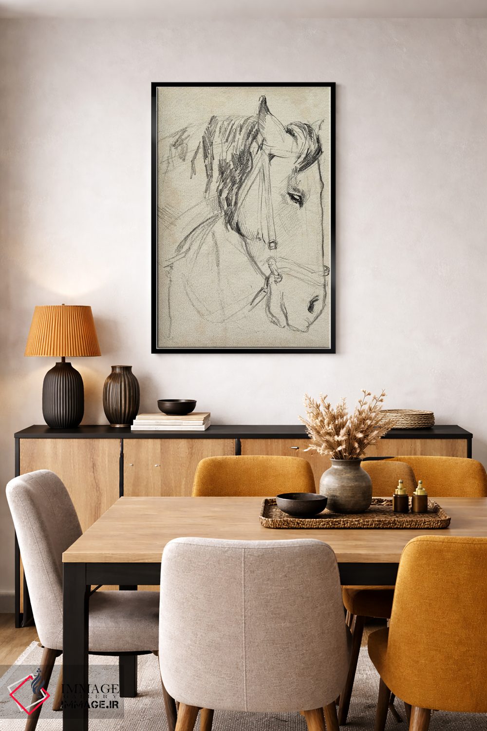 «اسب با مهار به صورت طراحی ۱» اثرِ «جنیفر پکستون پارکر» با حالوهوای دکور معاصر و موضوعِ این اثر، برای نشیمنهای امروزی و چیدمانهای ساده انتخابی دقیق است.
