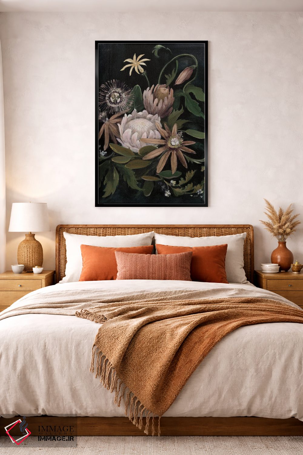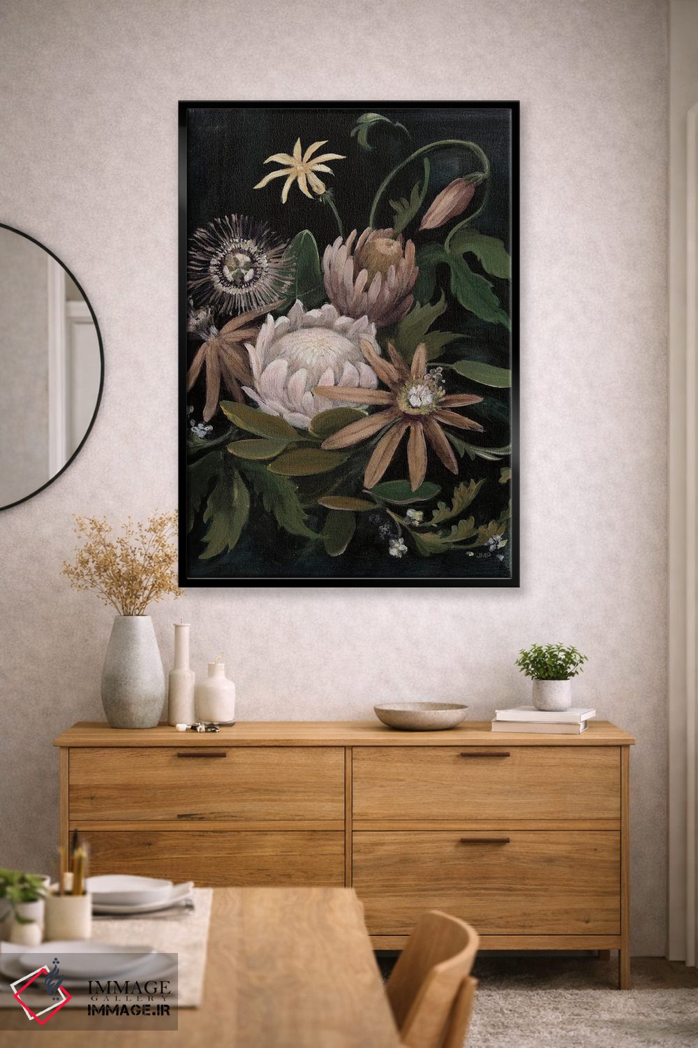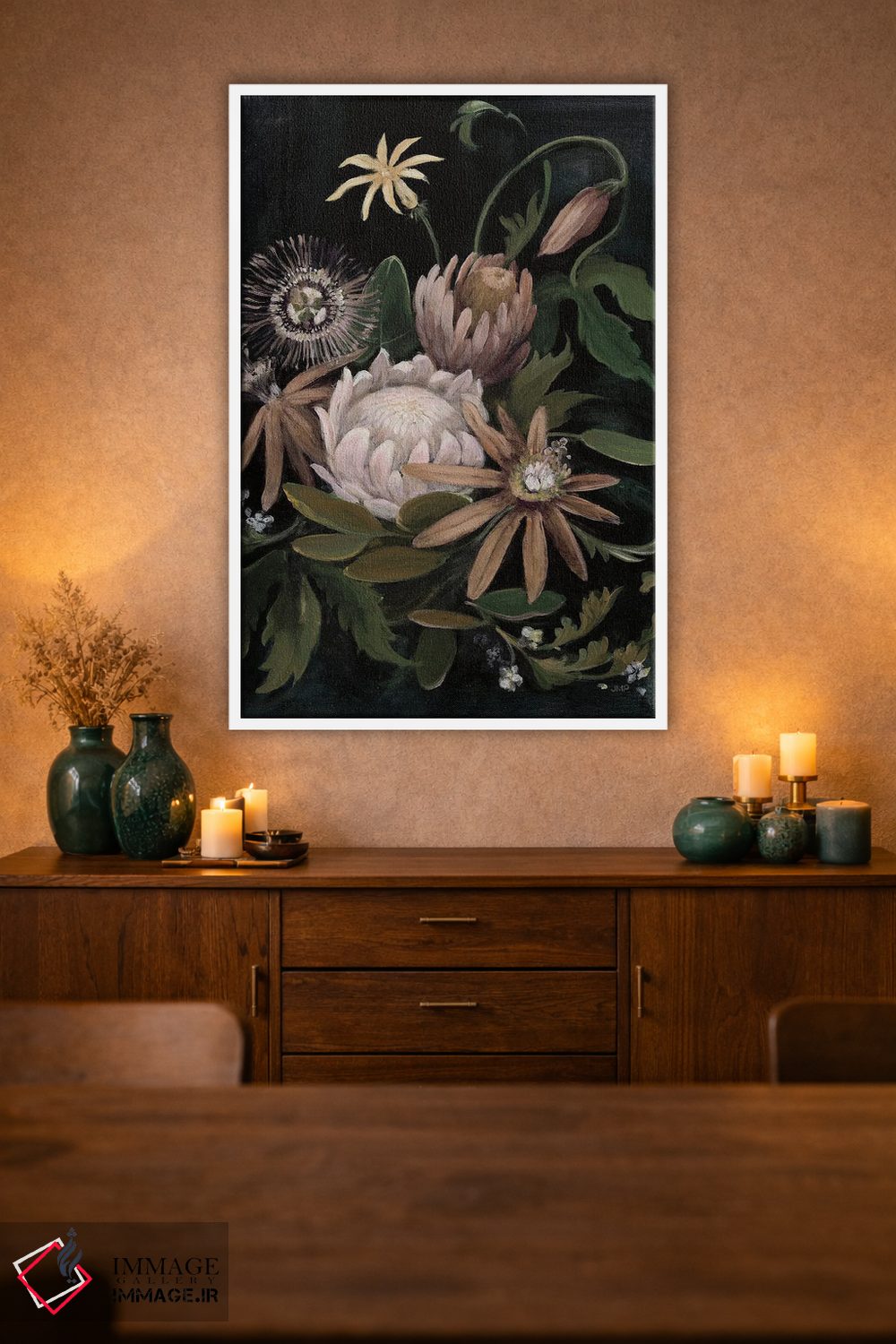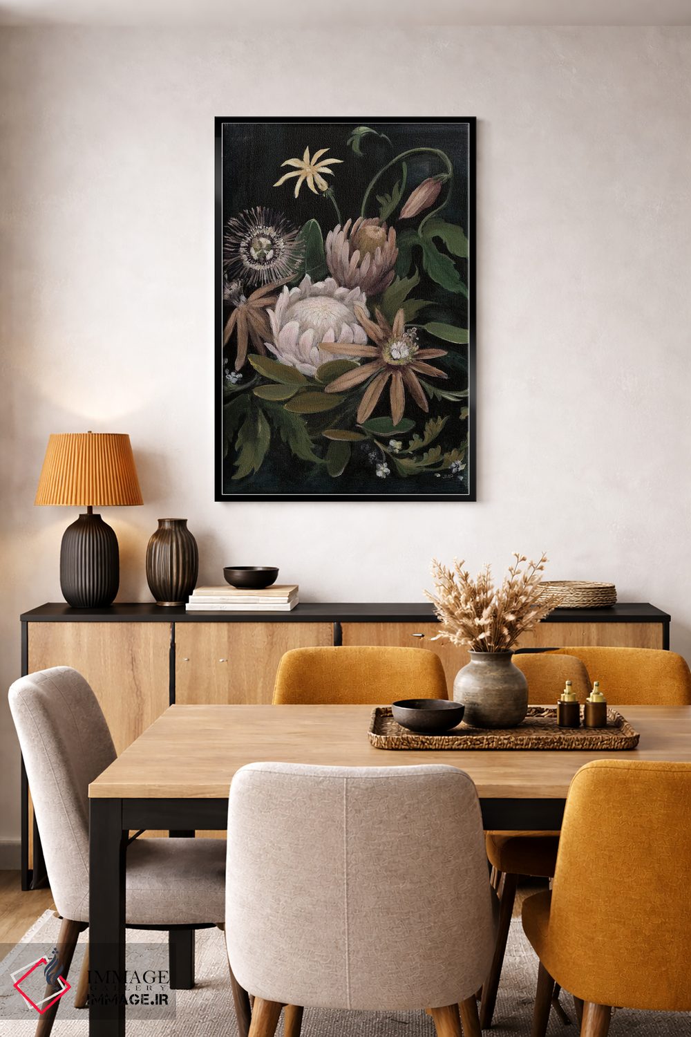 براساس پالت گرم اثر، قاب بلوط روشن (چوبی) پیشنهاد اول است و استخوانی ملایم مکمل. برای سفارشهای پروژهای با ابعاد و قابهای اختصاصی با ایماژ در تماس باشید.