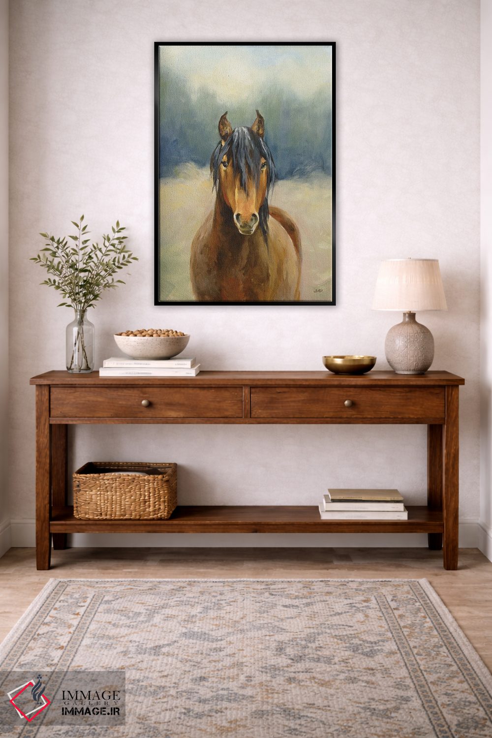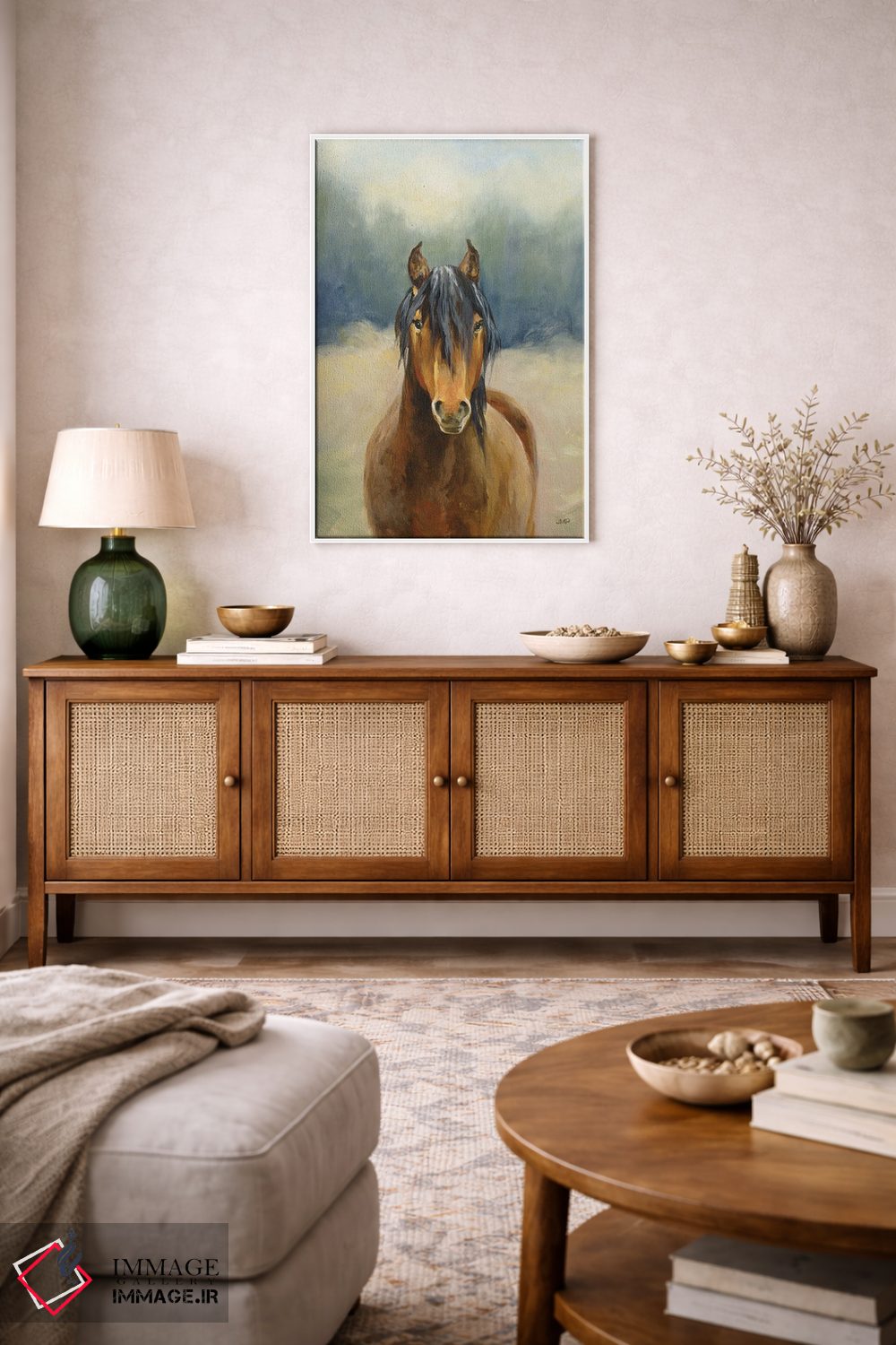 براساس پالت ترکیبی اثر، قاب بلوط روشن (چوبی) پیشنهاد اول است و استخوانی ملایم مکمل. برای سفارشهای پروژهای با ابعاد و قابهای اختصاصی با ایماژ در تماس باشید.
