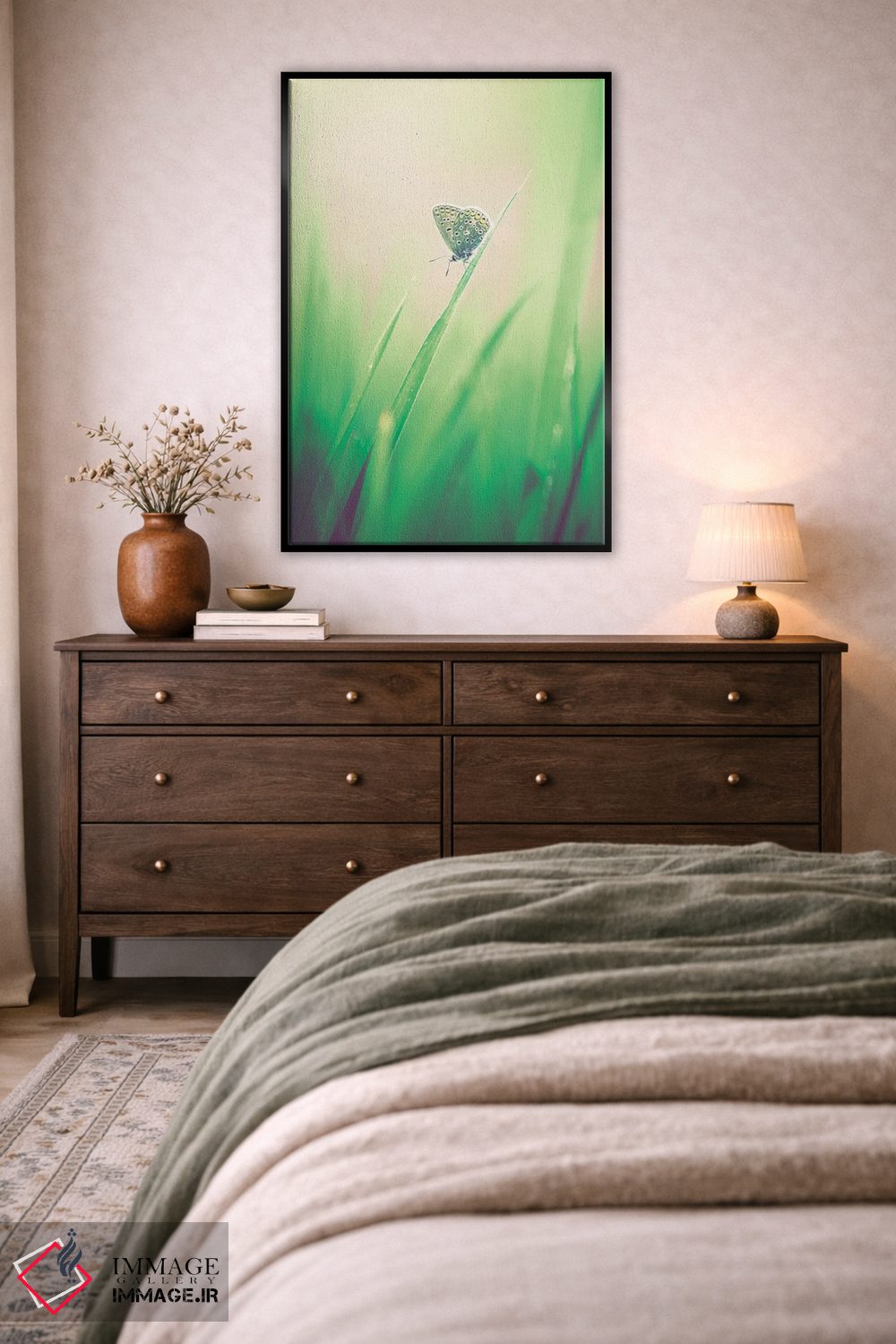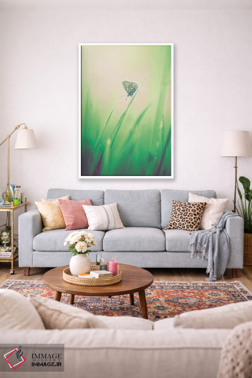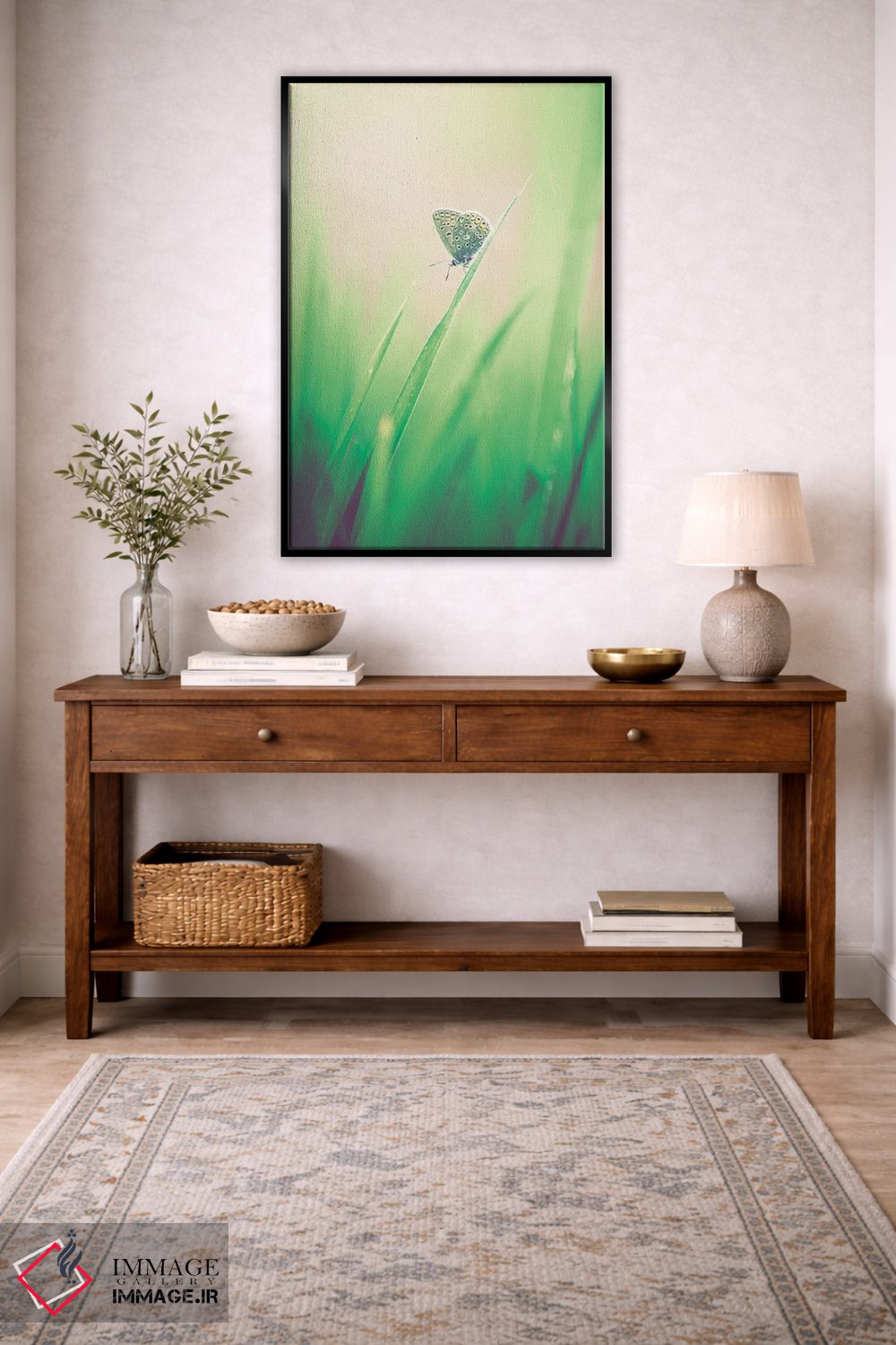 «پروانه کوچک در علفزار» اثرِ «جفرسون کاستلاری» میتواند به دیوار، انرژیِ نرم و زنده بدهد؛ برای فضاهای روستیک یا بوهو پیشنهاد میشود. با نورپردازی نقطهای، جذابتر هم میشود.