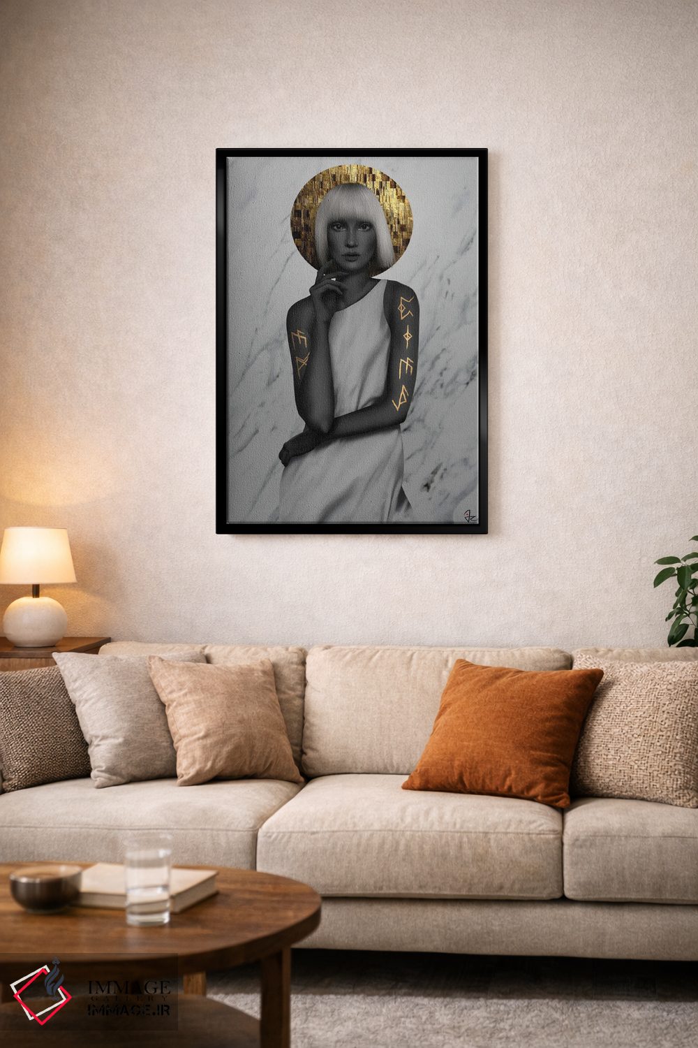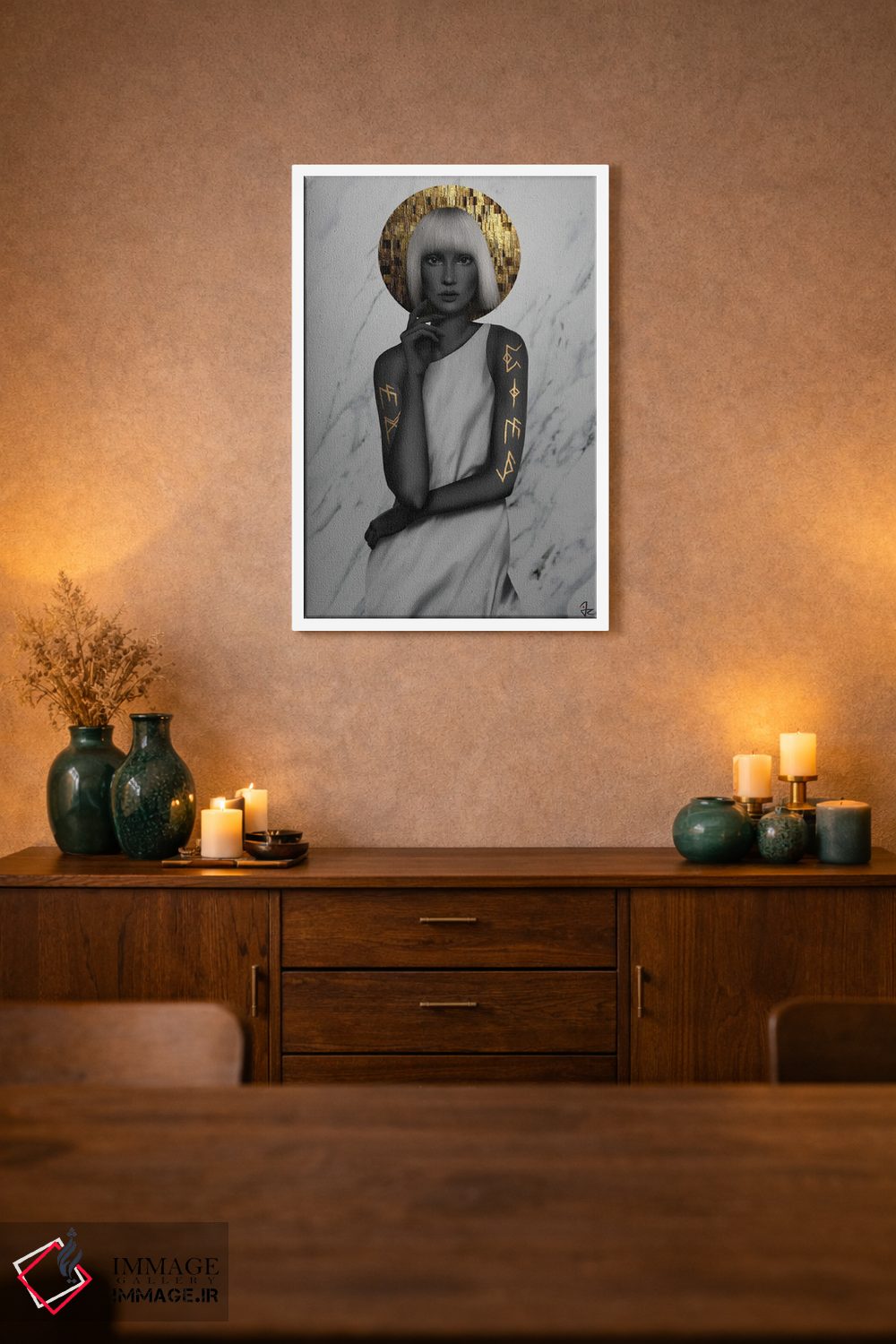 براساس پالت گرم اثر، قاب تیک گرم (چوبی) پیشنهاد اول است و مشکی مات (فریم متوسط) مکمل. برای سفارشهای پروژهای با ابعاد و قابهای اختصاصی با ایماژ در تماس باشید.