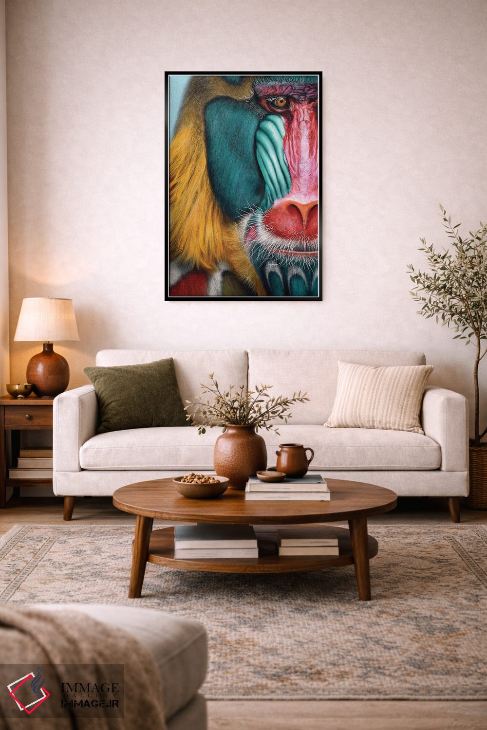 این اثر با عنوان «ماندریل (نوعی میمون)» اثرِ «جولیو روسی» به دیوار، انرژیِ نرم و زنده میدهد؛ برای راهروها و ورودیهای گرم انتخابی خوشسلیقه است. برای دیوار گالریوار هم گزینهٔ خوبیست.