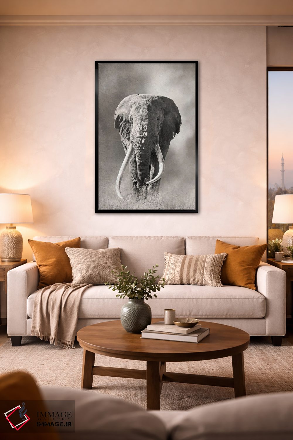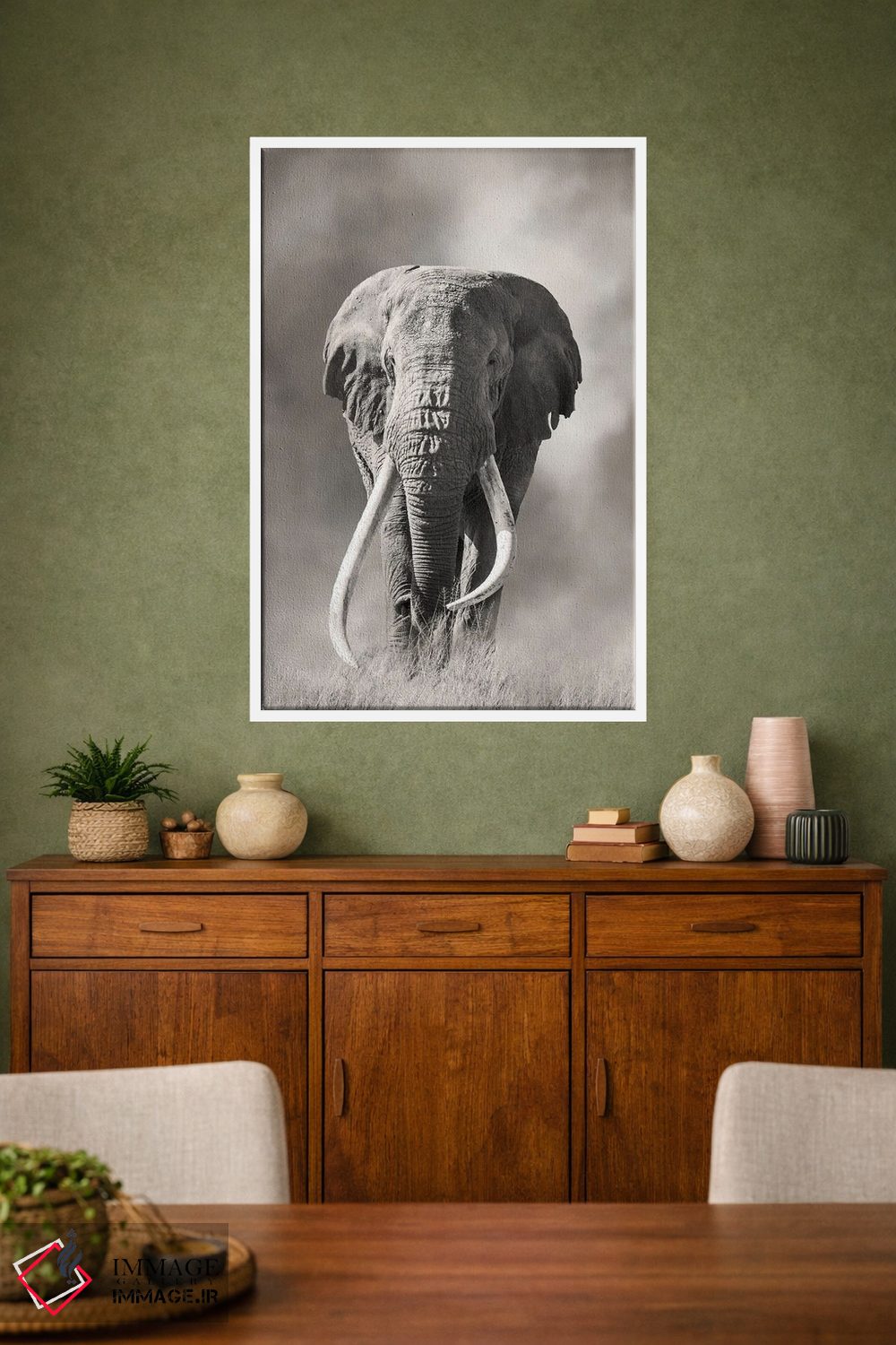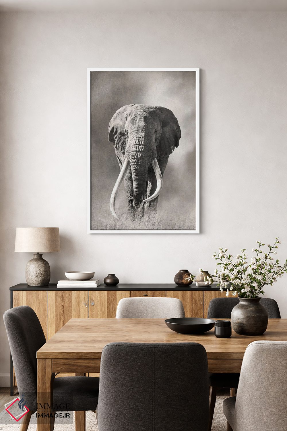 اگر به آثار حیوانات علاقه دارید، «فیل نر عظیم با عاج بزرگ از گرد و غبار پارک ملی امبوسلی بیرون میآید» اثرِ «جین ریکس» گرما و شخصیت به فضا اضافه میکند، برای راهروها و ورودیهای گرم گزینهٔ مناسبیست. در کنار گیاهان و نور طبیعی، جذابتر هم میشود.